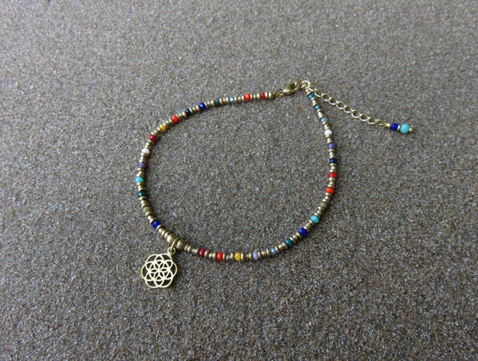 Anklet with brass flower and colored beads