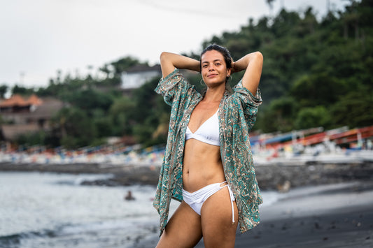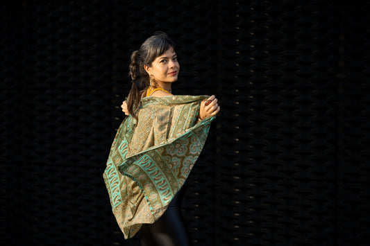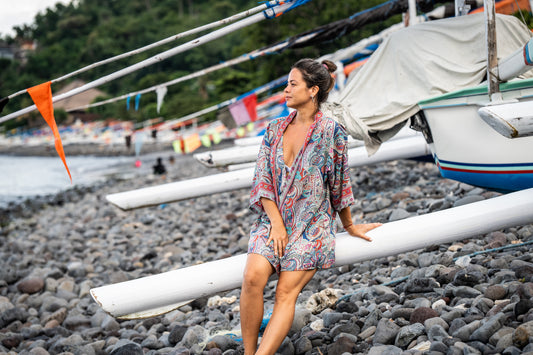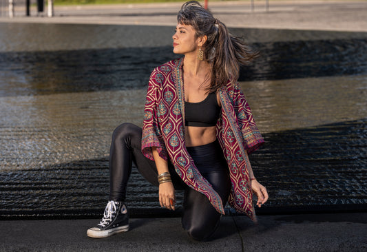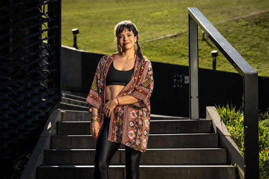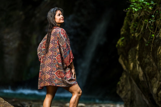 colorful patterned kimono, blouse, throw, light jacket in green, pink and light blue