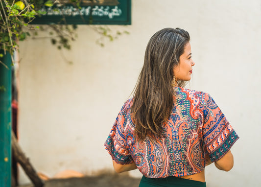 blue orange patterned kimono, blouse, cover-up, light jacket