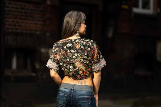 kurzer Kimono zum Binden, Bluse, Sommerbluse, Überwurf, schwarz bunt gemustert