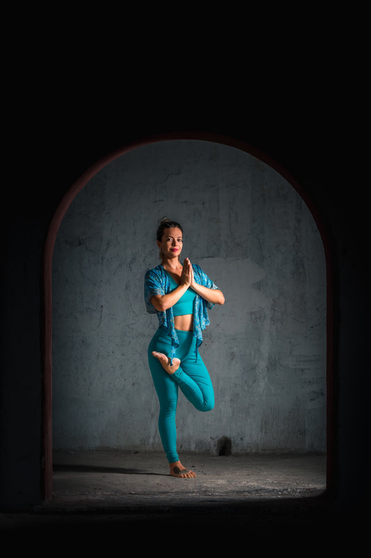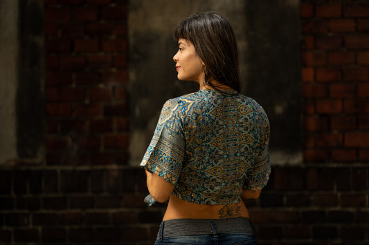 kurzer Kimono zum Binden, Bluse, Sommerbluse, Überwurf, türkis blau gold gemustert