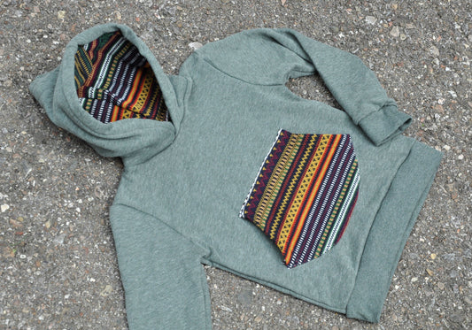 Children's sweater with colorful pocket and green hood lining