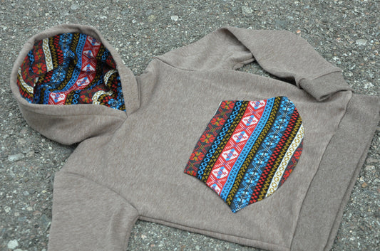 Children's sweater with colorful pocket and hood lining, brown