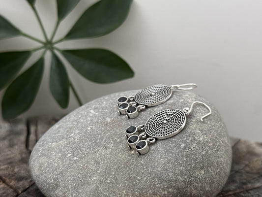 filigran verzierte, hängende Ohrringe mit 3 kleinen baumelnden schwarzen Spinell Steinen