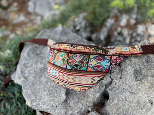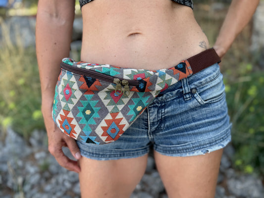 praktische Bauchtasche mit Reißverschluss und geometrischem Muster in türkis beige orange rot