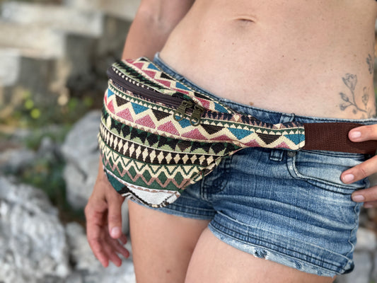 praktische Bauchtasche mit Reißverschluss und geometrischem Muster in braun rosa blau olive