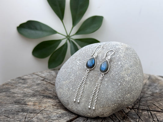 tropfenförmige Ohrringe mit Labradorit Stein und baumelnden Kettchen aus Silber