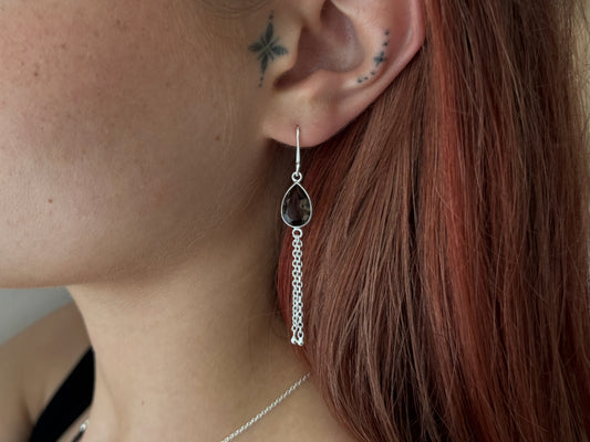 tropfenförmige Ohrringe mit facettiertem Rauchquarz Stein und baumelnden Kettchen aus Silber