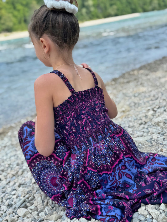luftiges Elfenkleid für Kinder, rosa blau gemustertes Sommerkleid im Boho Look für Mädchen, Fransenkleid