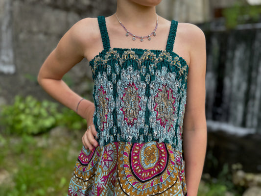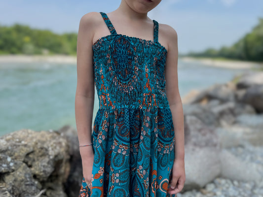 luftiges Elfenkleid für Kinder, türkis orange gemustertes Sommerkleid im Boho Look für Mädchen, Fransenkleid