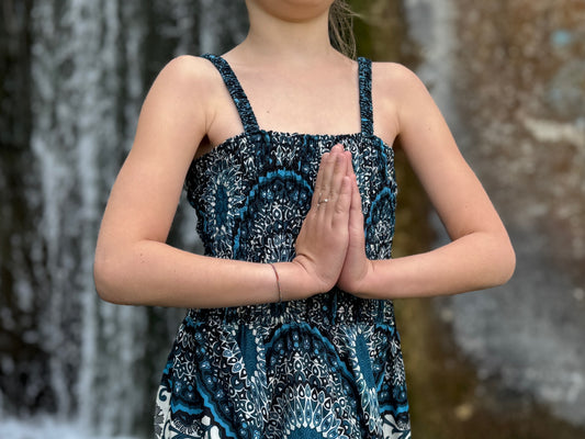 luftiges Elfenkleid für Kinder, weiß blau gemustertes Sommerkleid im Boho Look für Mädchen, Fransenkleid