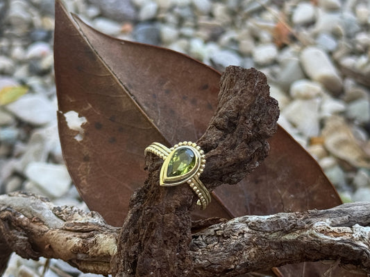 filigran verzierte, hängende Ohrringe mit 3 kleinen baumelnden grünen Peridot Steinen