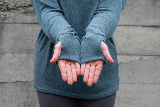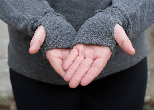PLUS SIZE, long, plain knitted sweater with a large hood and thumbholes in gray