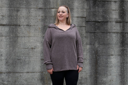 PLUS SIZE, long, plain knitted sweater with a large hood and thumbholes in brown