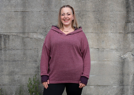 PLUS SIZE, long knitted sweater with a patterned hood and thumbholes in rose red