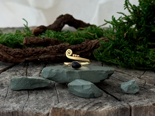 Zehenring mit Spirale, Pünktchen und Stein in Tropfenform aus Messing, vergoldet