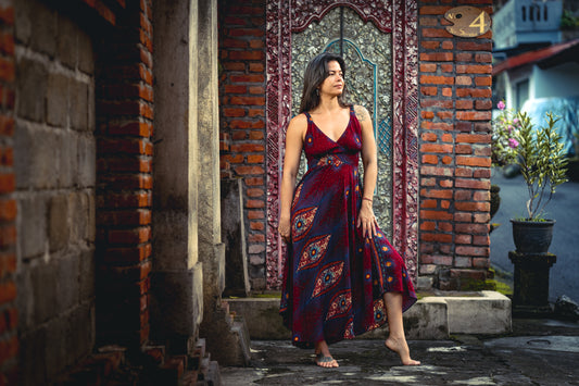 langes ärmelloses Kleid mit V-Ausschnitt in rot blau bunt