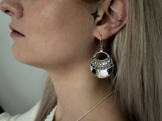 große hängende Ohrringe mit gemustertem Halbkreis aus Silber