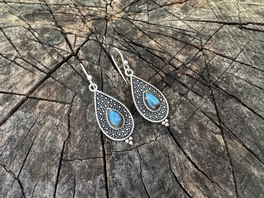 Hängeohrringe mit Labradorit Steinen auf gepunktetem Tropfen aus Silber