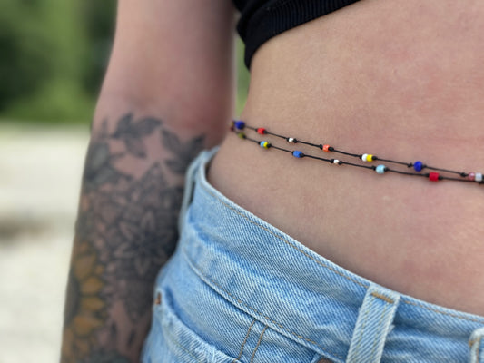 zweireihige Bauchkette mit bunten Glasperlen und kleinen Silberkügelchen