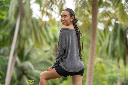 Yoga Top mit Rückenmuster und Messingelementen in grau