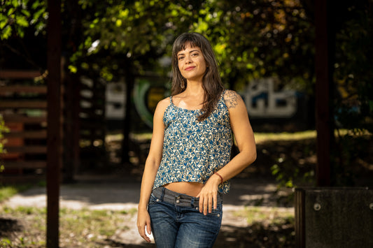Batik Yoga Top mit floralem Print in blau grün