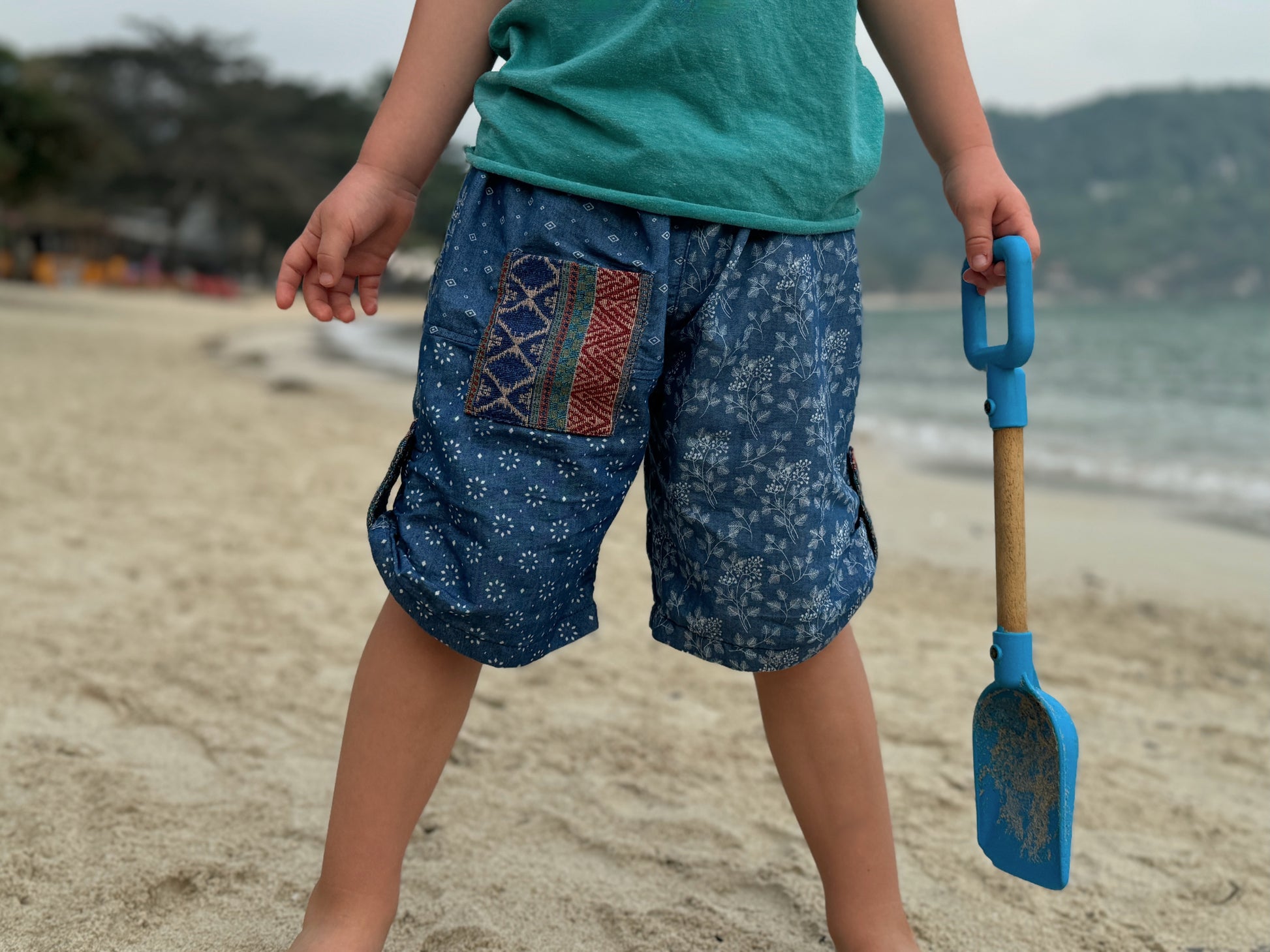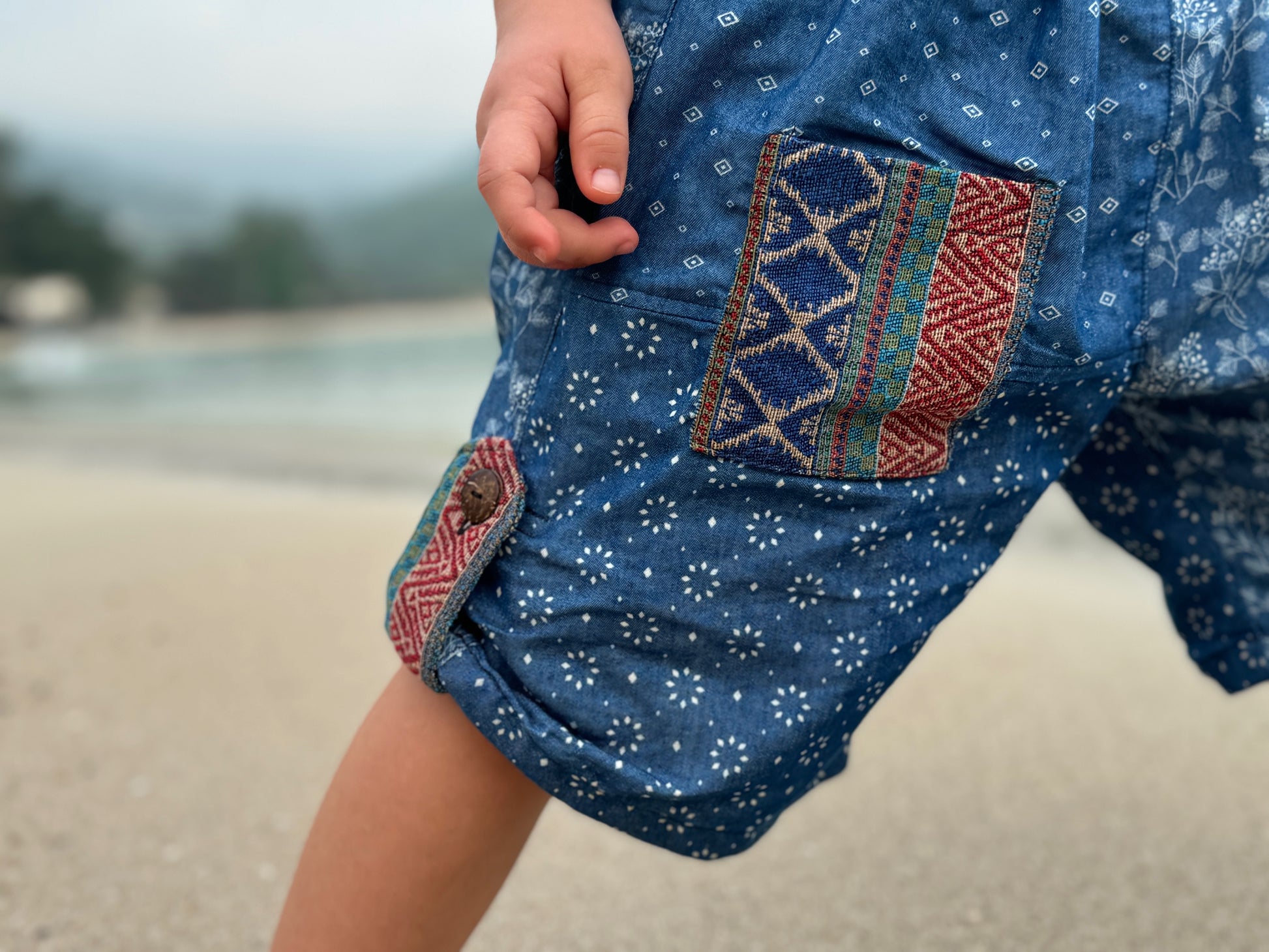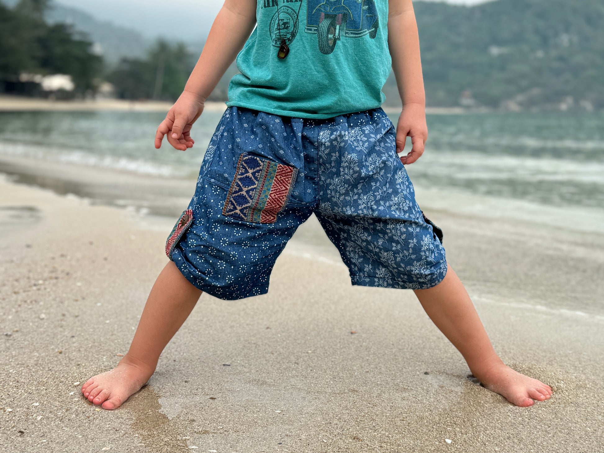 bequeme Pumphose im Patchworklook mit Taschen für Kinder in blau. Die Hose kann durch die seitlichen Kokosnuss Knöpfe seitlich gerafft werden. Die Pumphose wächst mit und kann als lange, 3/4 Hose sowie als Shorts getragen werden