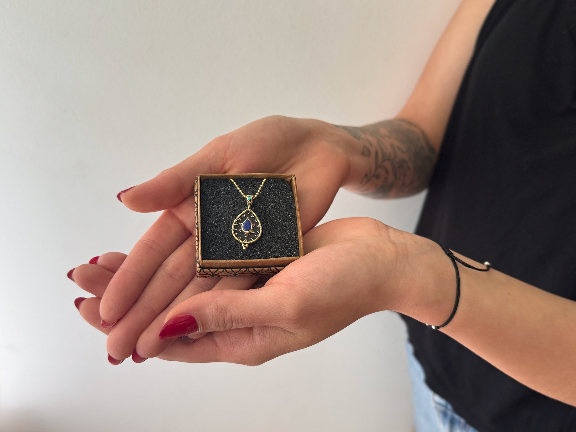 Ob einzeln getragen oder mit anderen Ketten kombiniert – dieses Schmuckstück bringt Wärme, Farbe und einen Hauch von Orient in deinen Look.
