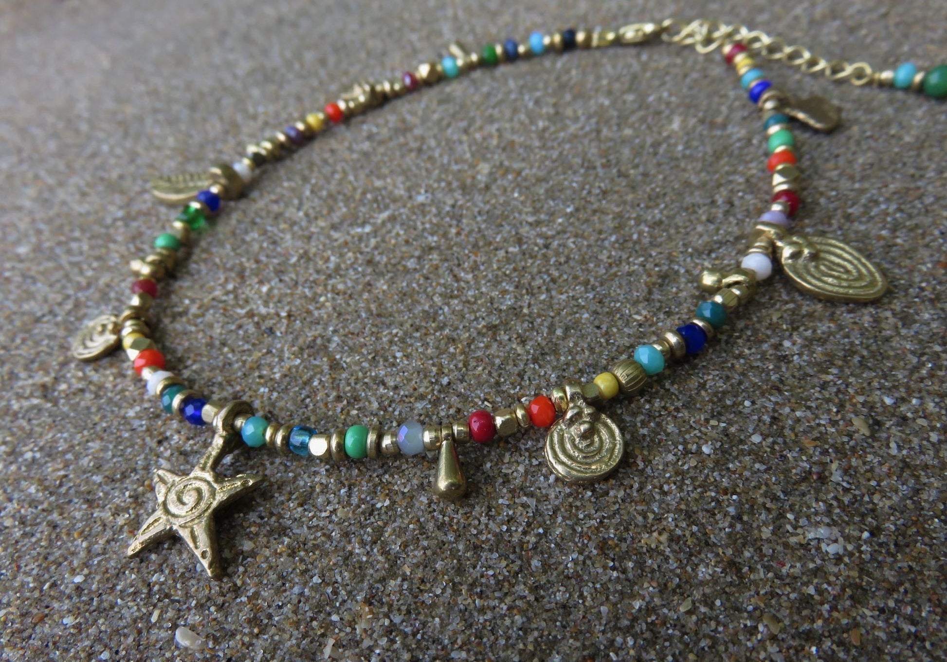 buntes Fusskettchen mit verschiedenen kleinen Anhängern aus Messing