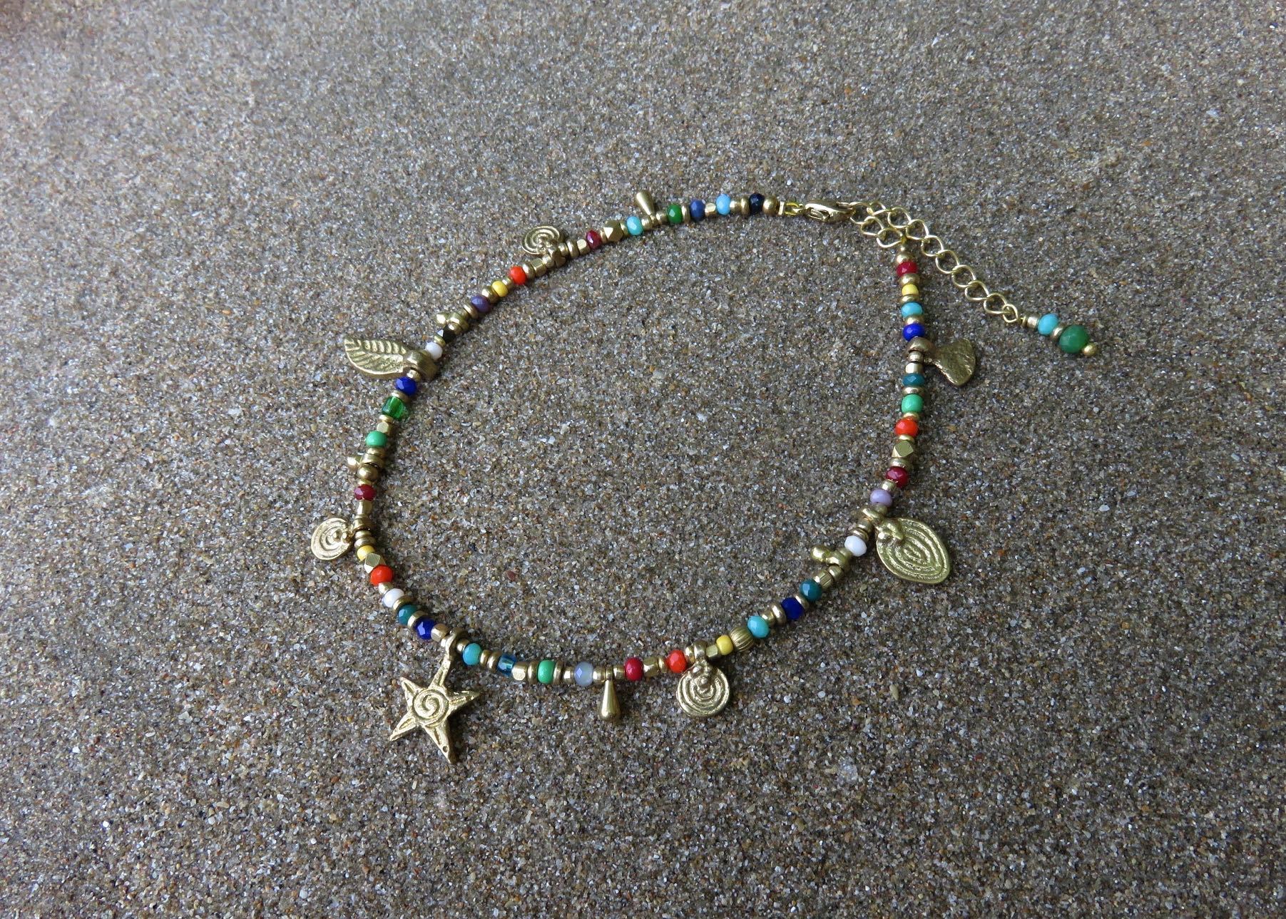Fusskettchen mit bunten Perlen und verschiedenen kleinen Anhängern aus Messing