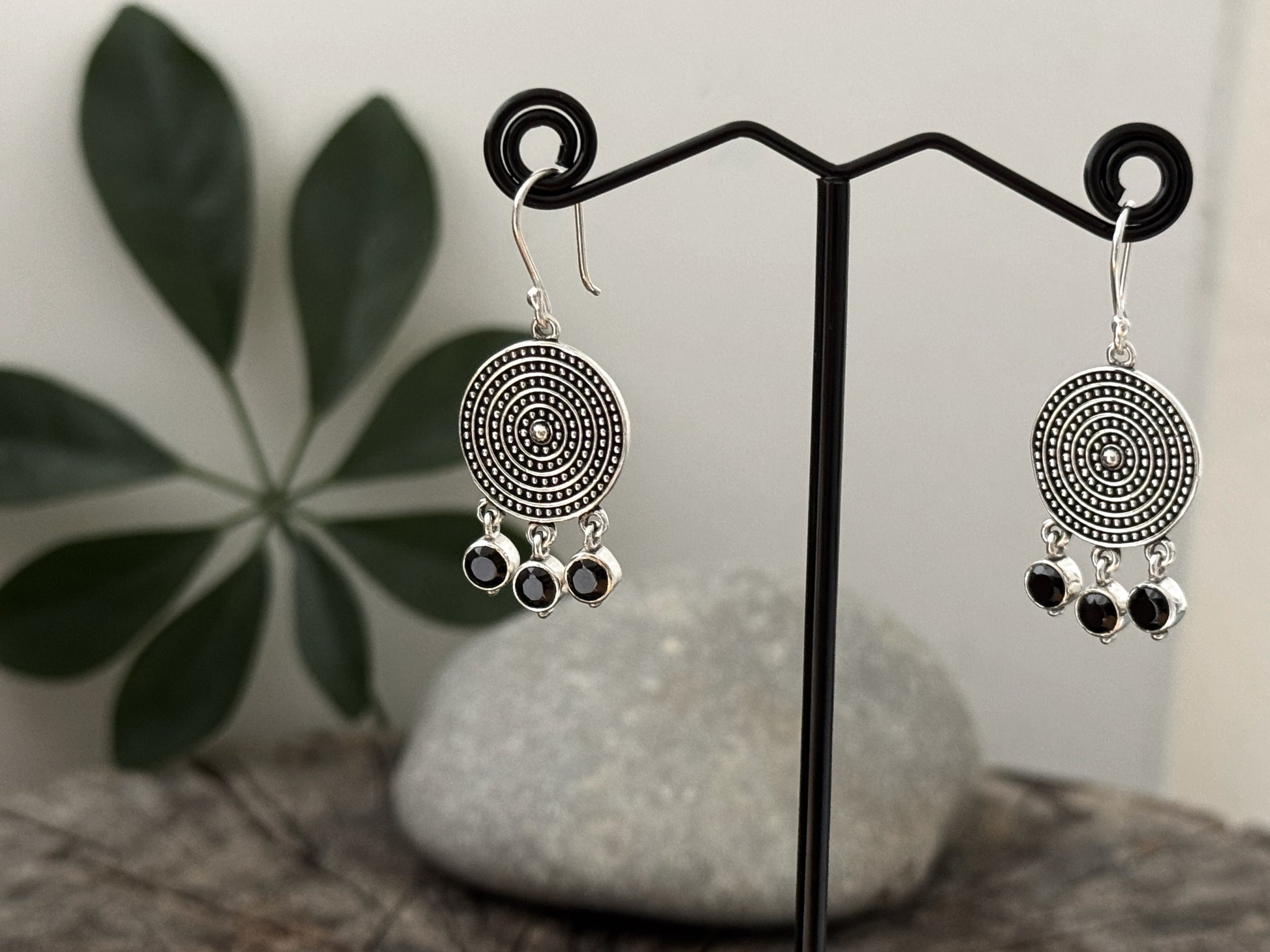 filigran verzierte, hängende Ohrringe mit 3 kleinen baumelnden schwarzen Spinell Steinen