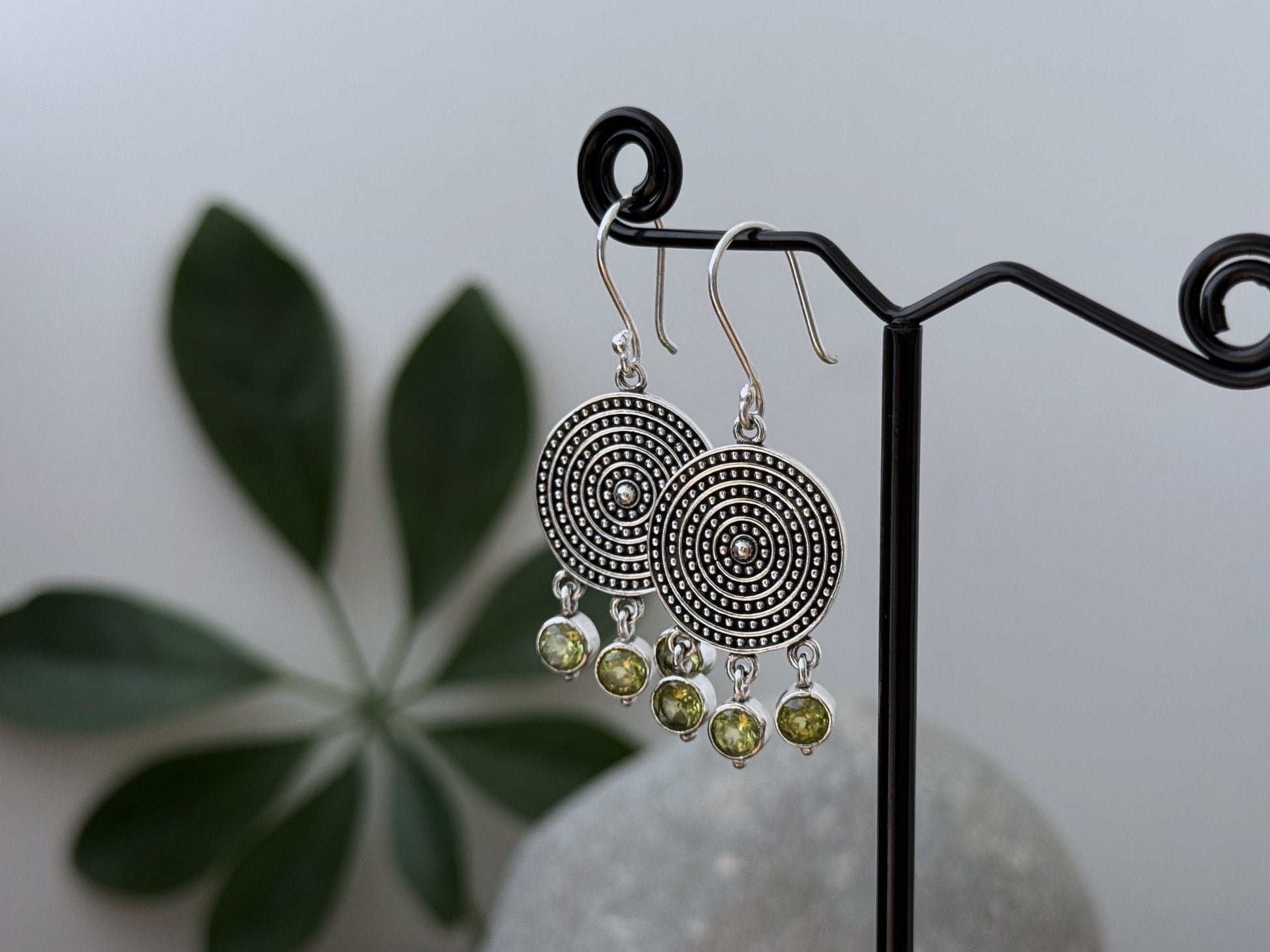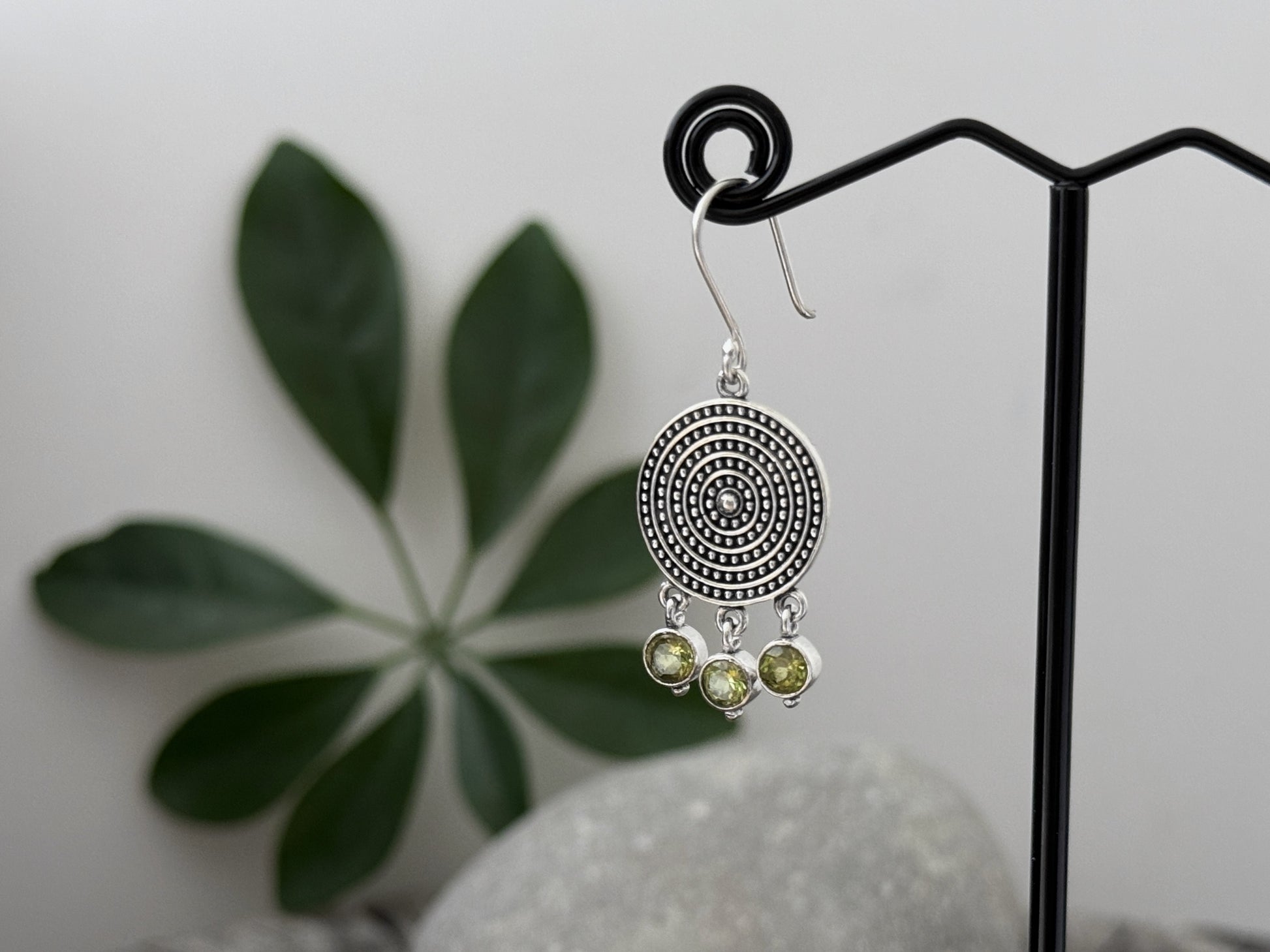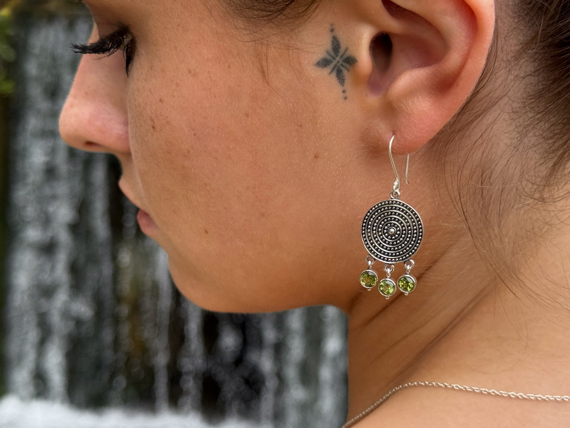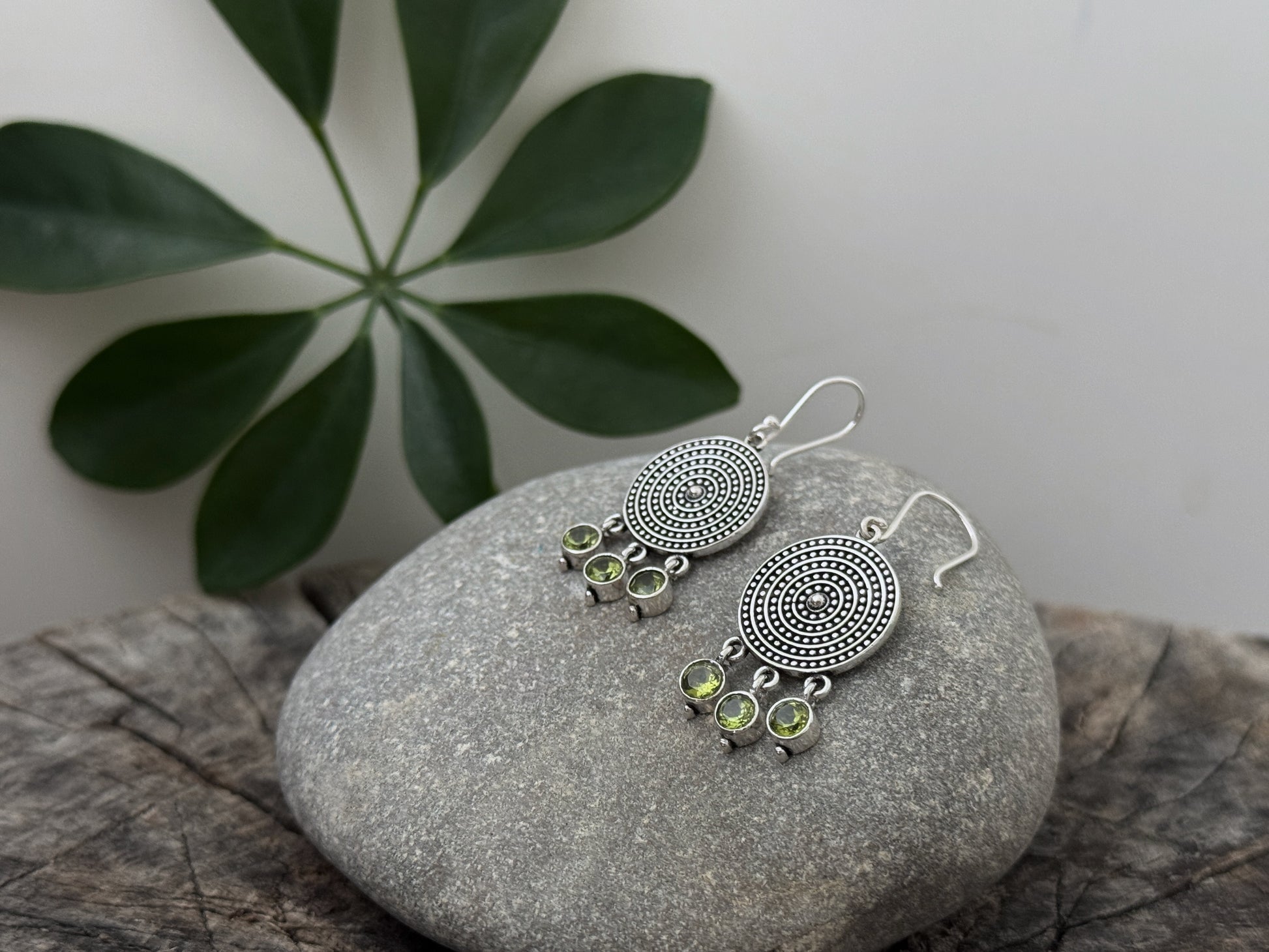 filigran verzierte, hängende Ohrringe mit 3 kleinen baumelnden grünen Peridot Steinen