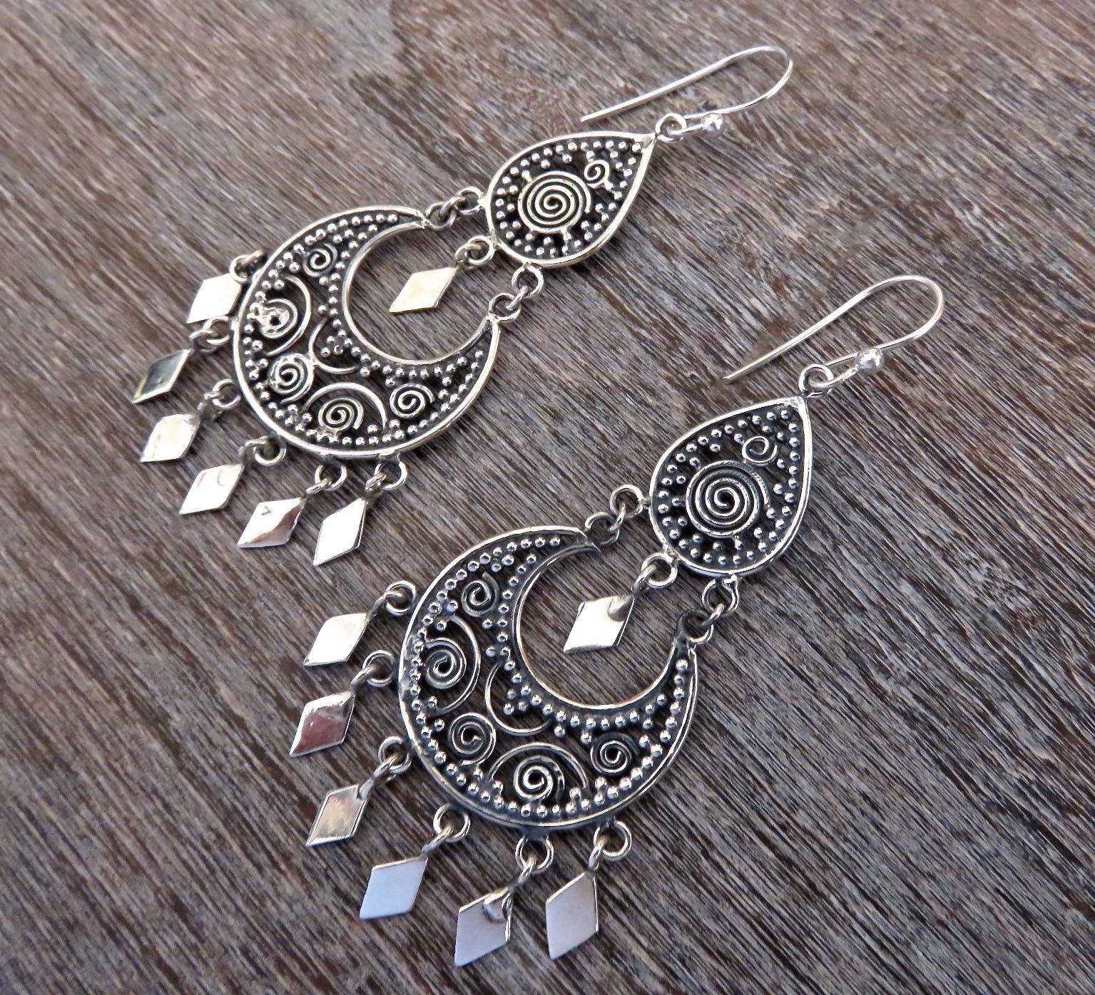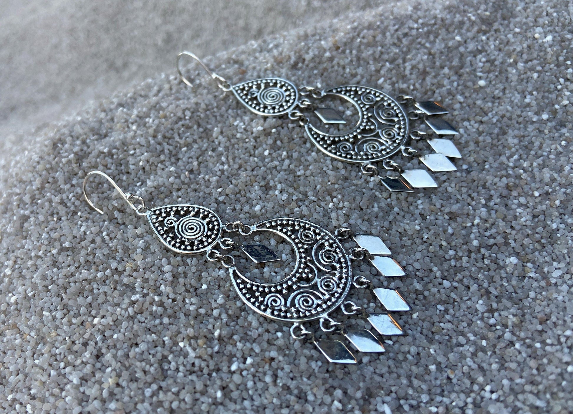 Diese kunstvoll gearbeiteten Ohrringe aus Silber vereinen filigrane Muster mit einem verspielten, eleganten Look. Der tropfenförmige obere Teil geht in ein detailreich verziertes Ornament über, das mit kleinen geometrischen baumelnden Anhängern abgerundet wird.