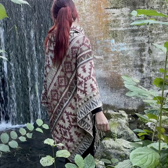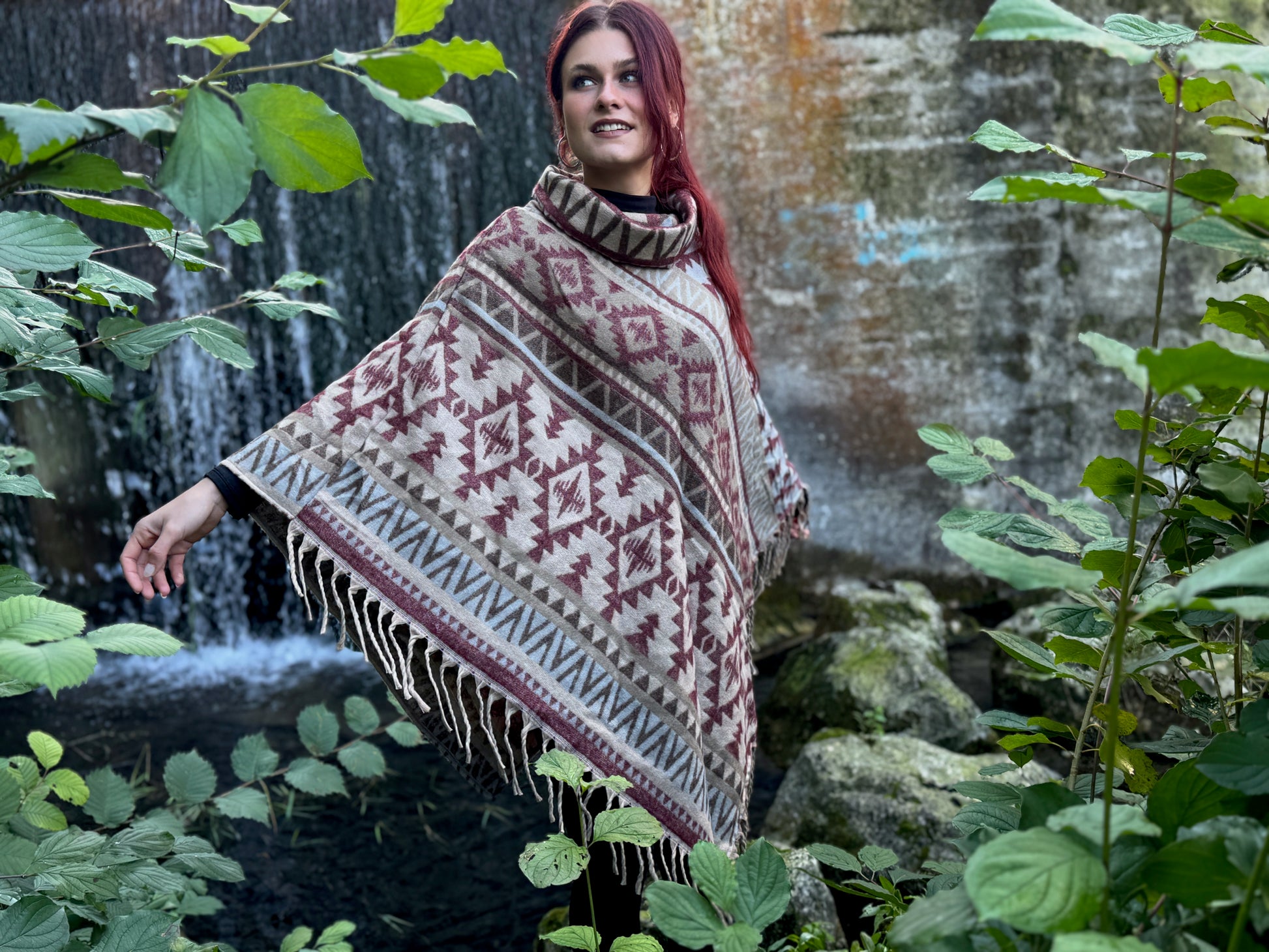 gemütlicher warmer Poncho, Überwurf, Bohemian Poncho, Boho Überwurf dunkelrot/beige/braun P06