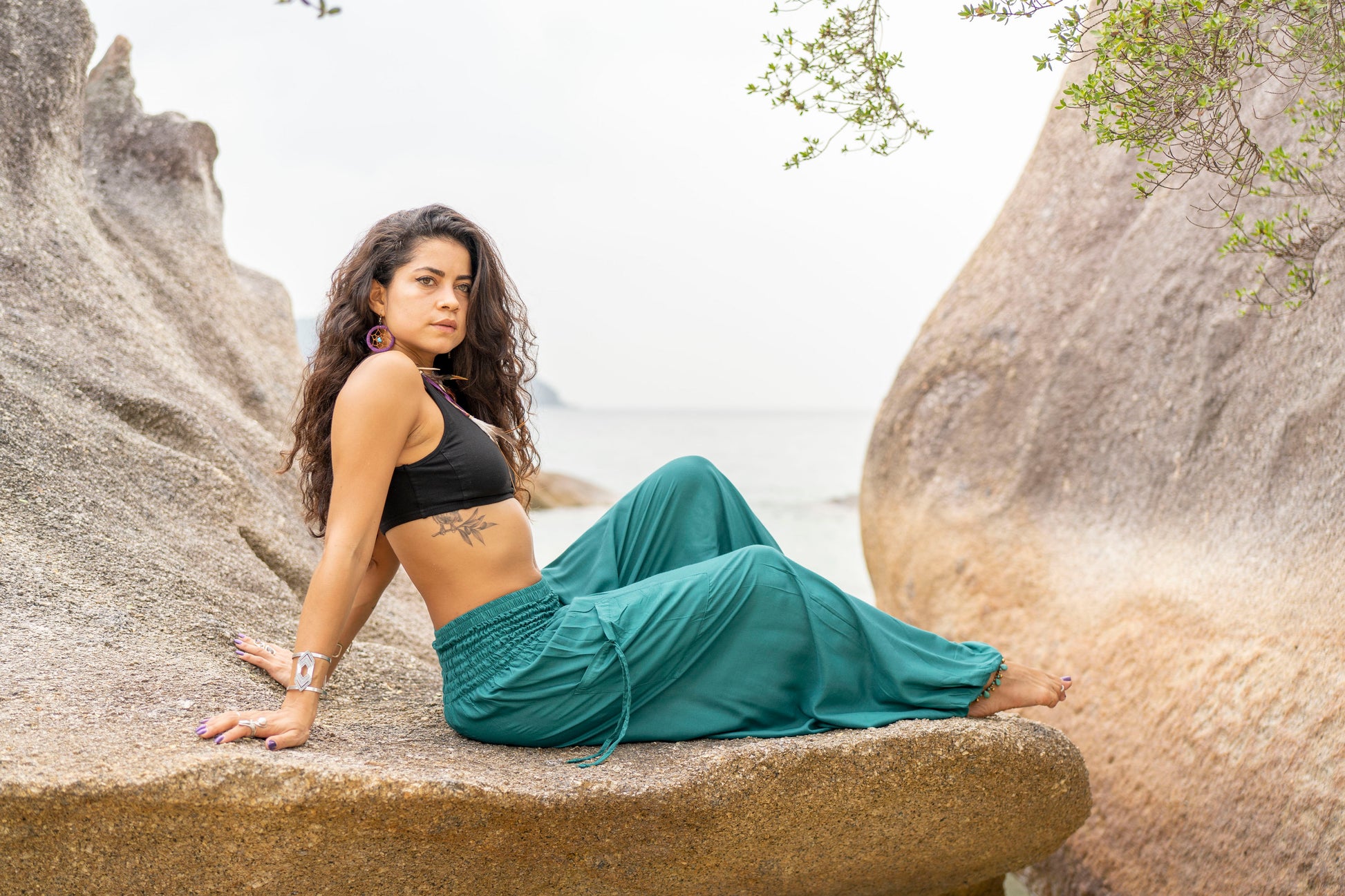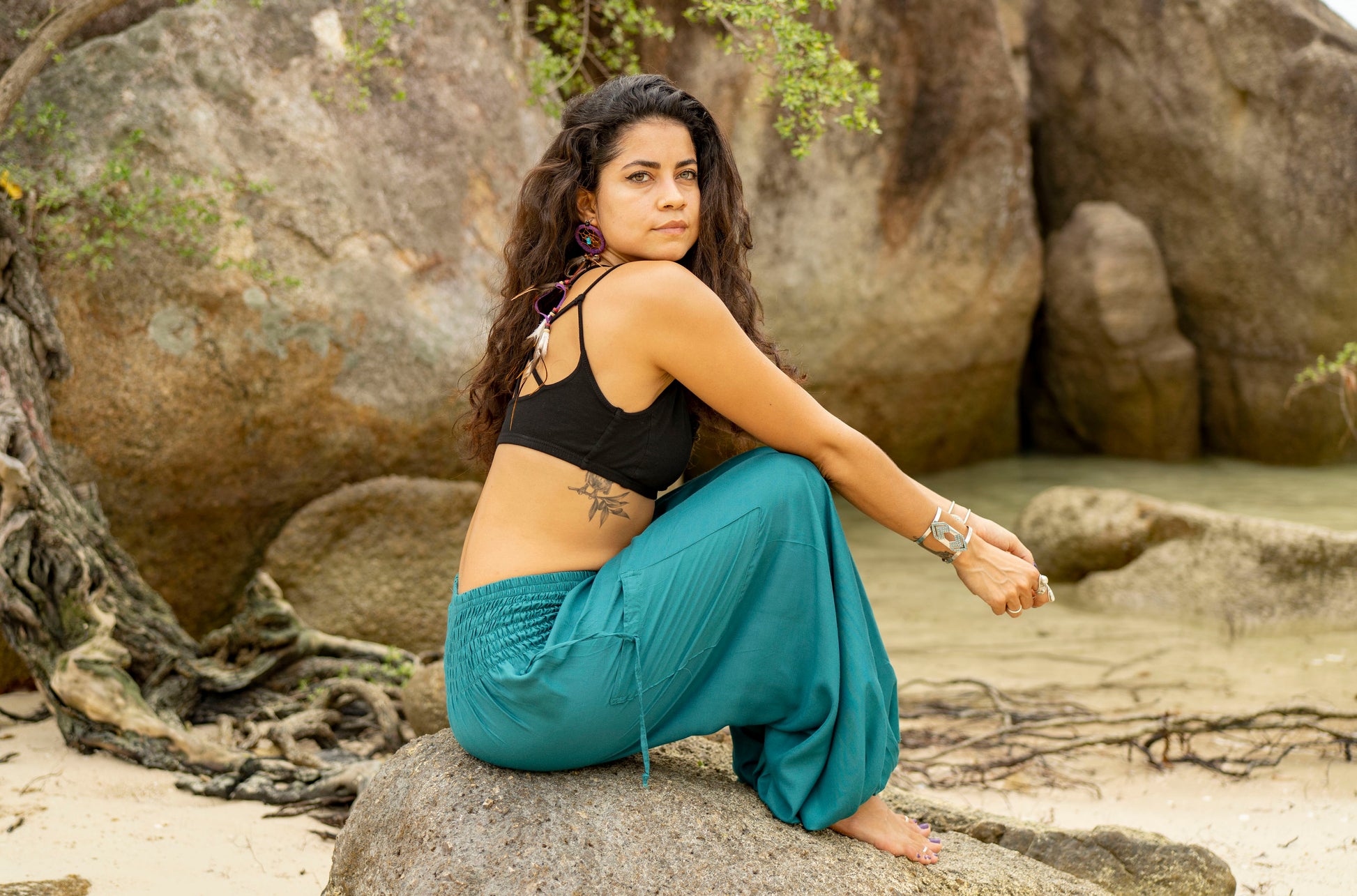 luftige einfarbige Pluderhose in türkis