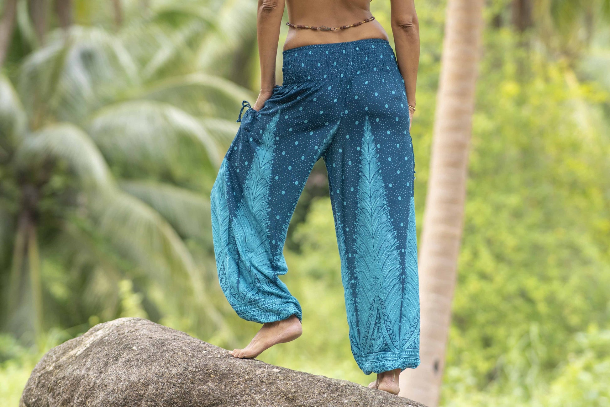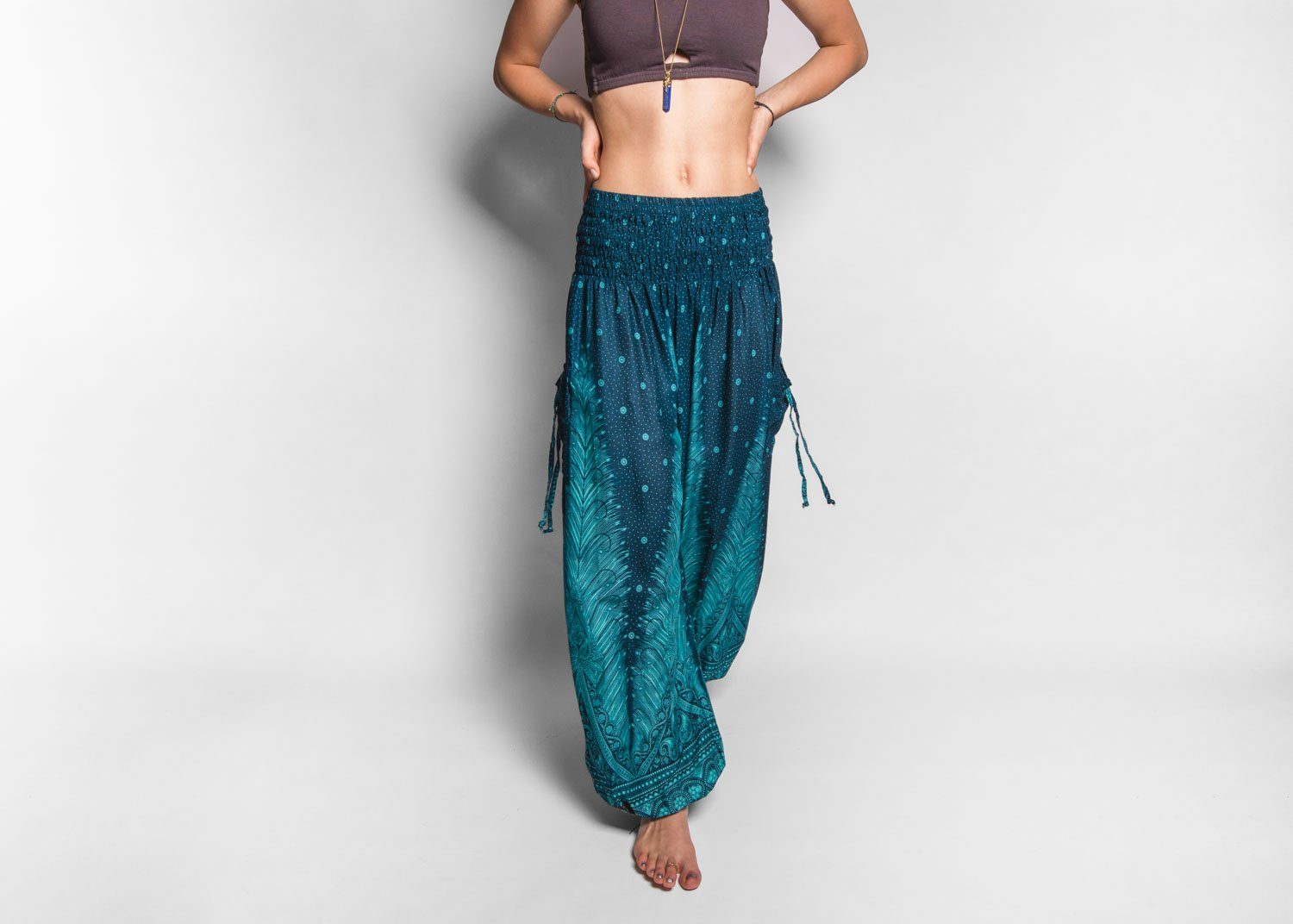 luftige Pluderhose mit Pfauenmuster in türkis mit Taschen