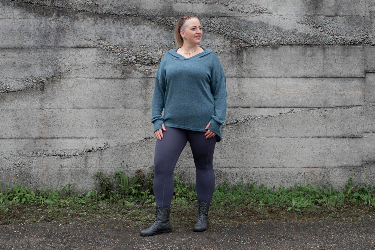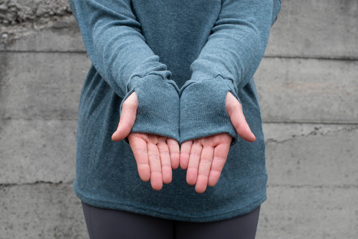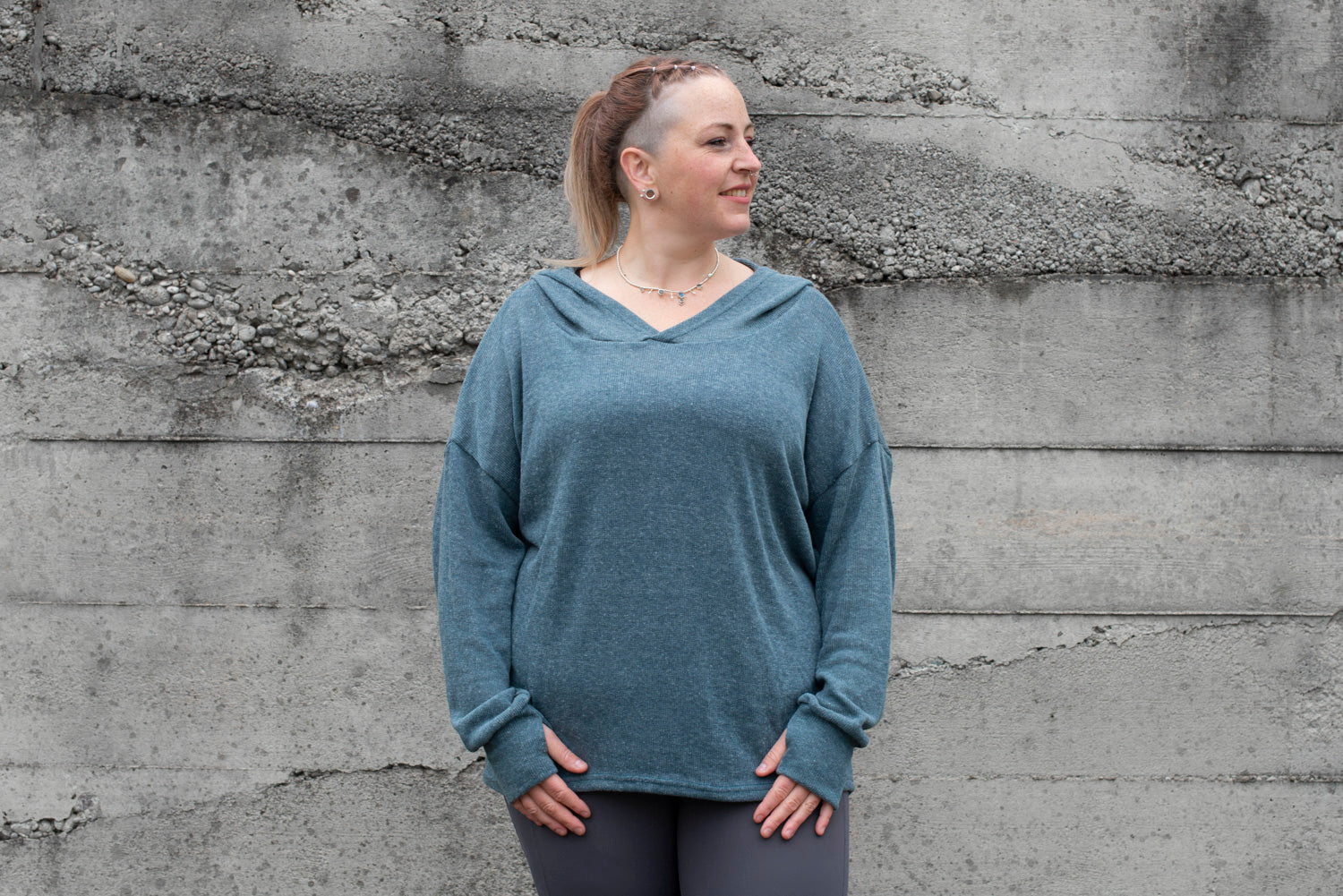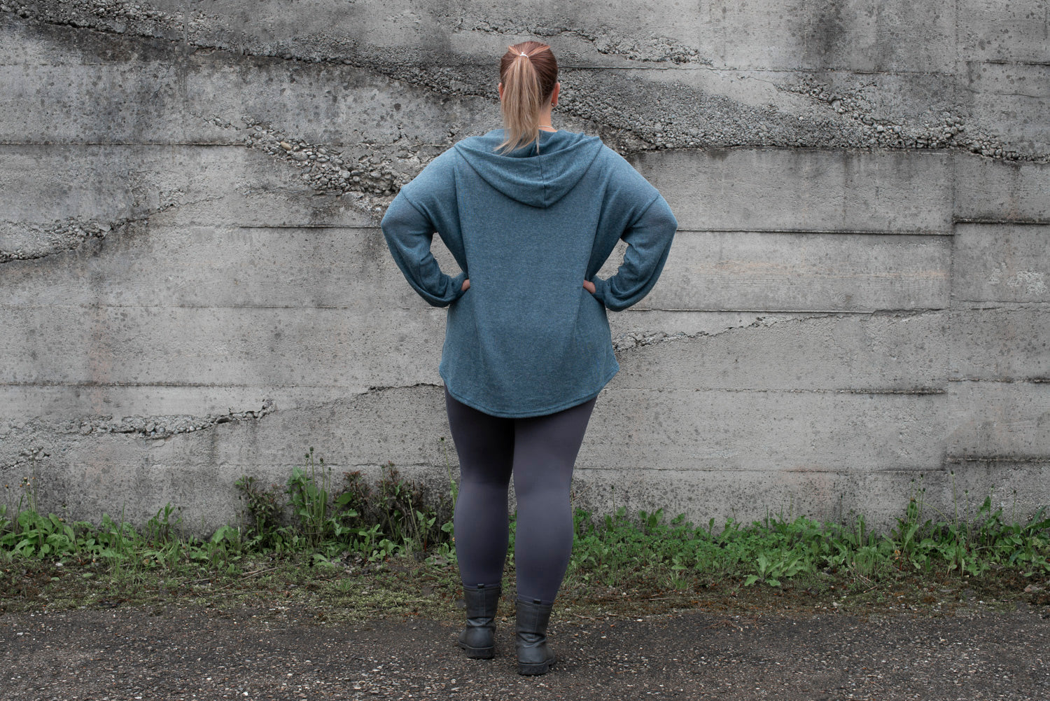 lockerer, gemütlicher, langer Kapuzenpullover in blau mit Daumenloch.