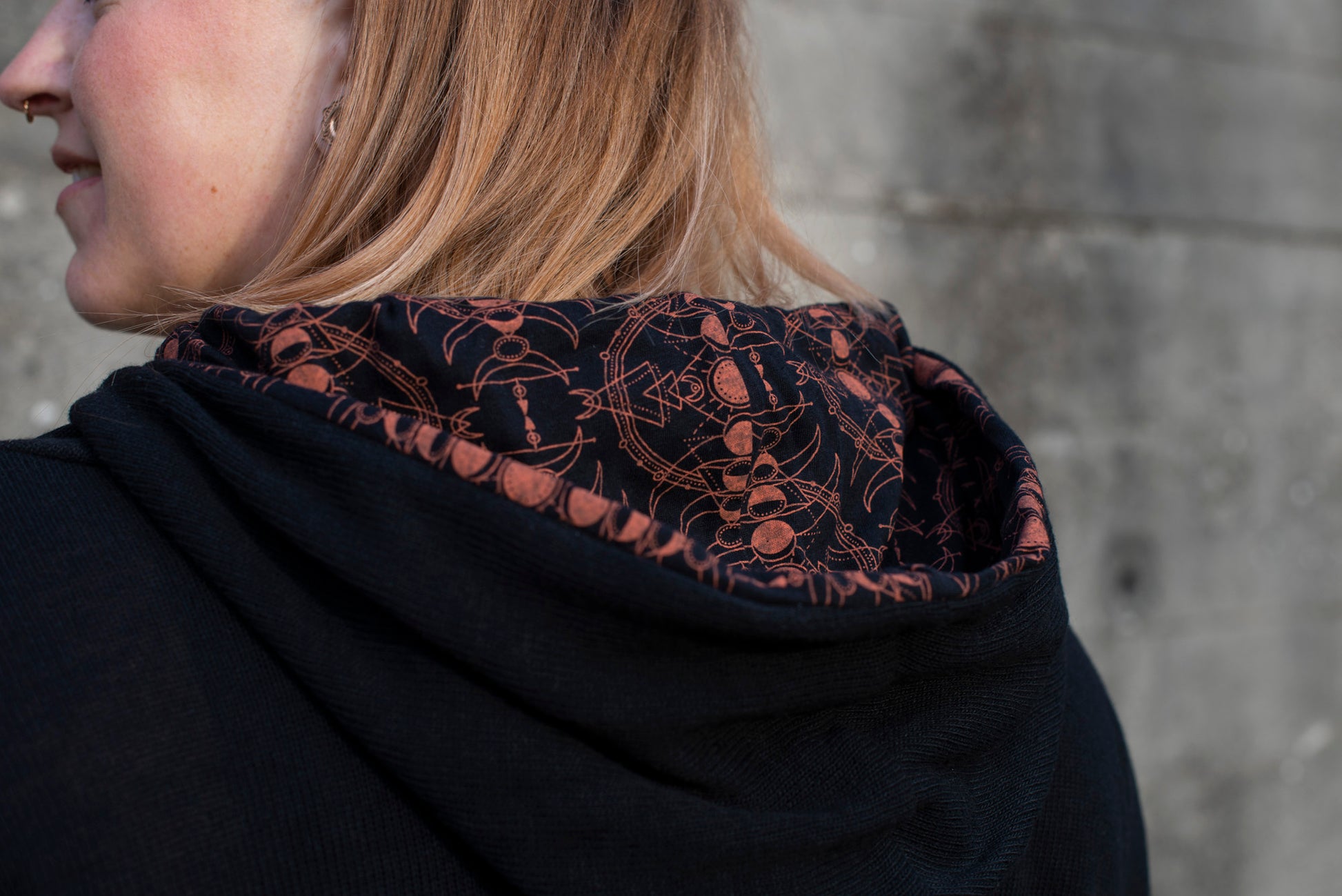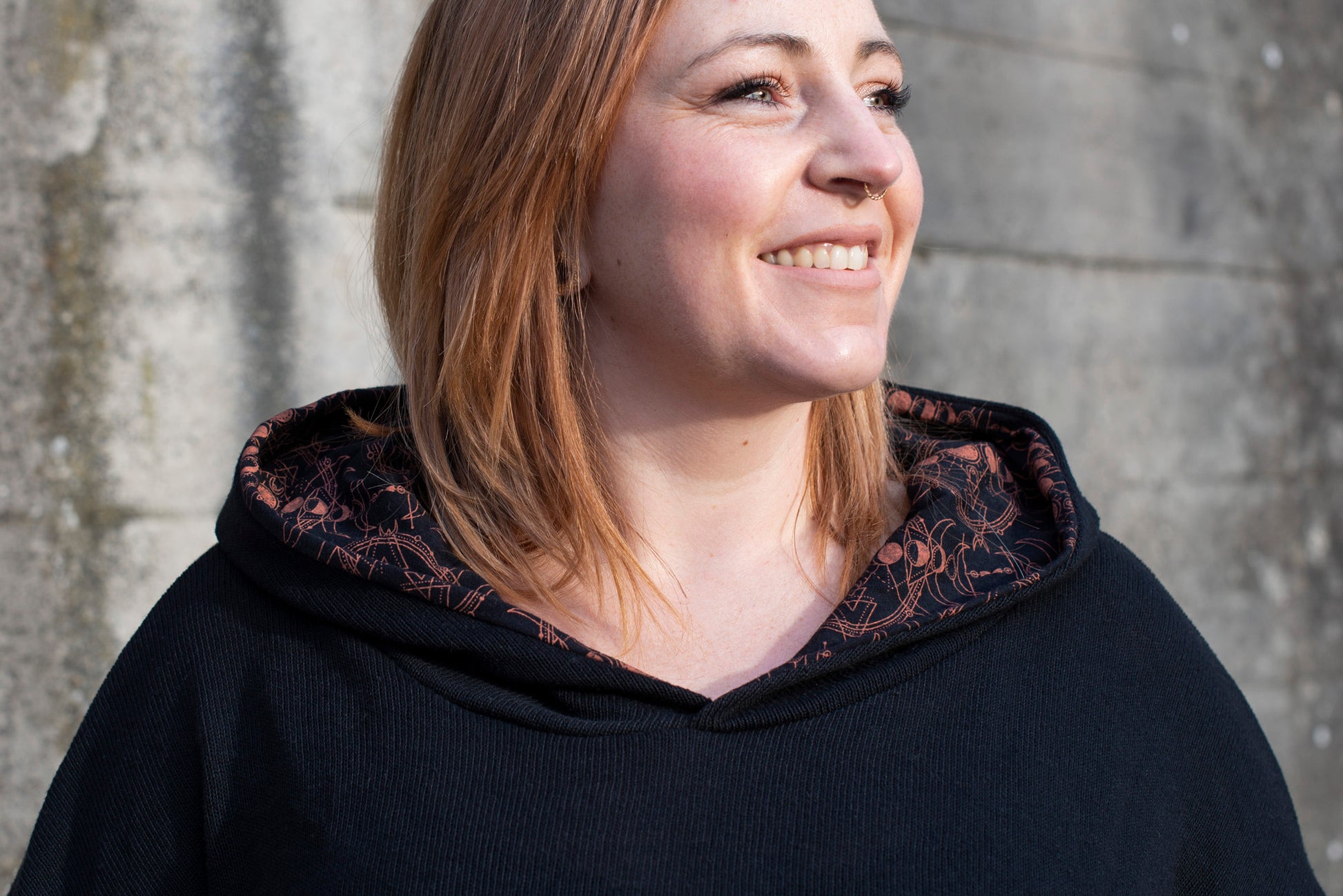 lockerer, gemütlicher Kapuzenpulli in schwarz mit Daumenloch. Ein farblich passender Stoff ist in die Kapuze eingearbeitet.