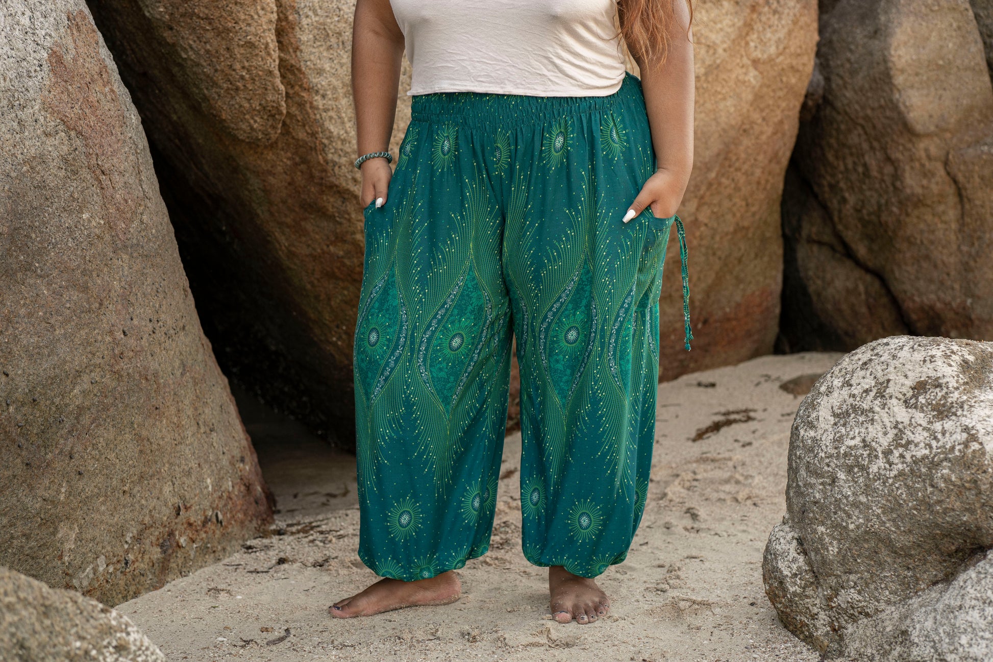 PLUS SIZE luftige Pluderhose mit Pfauenmuster in türkis