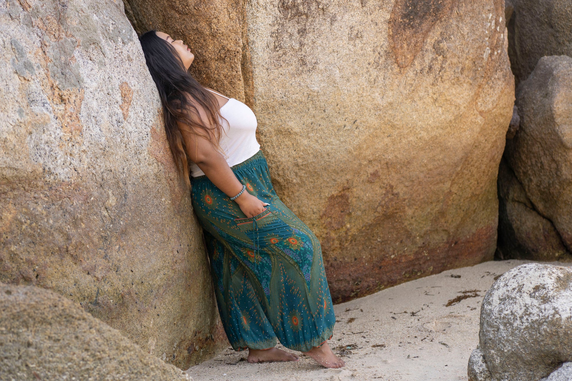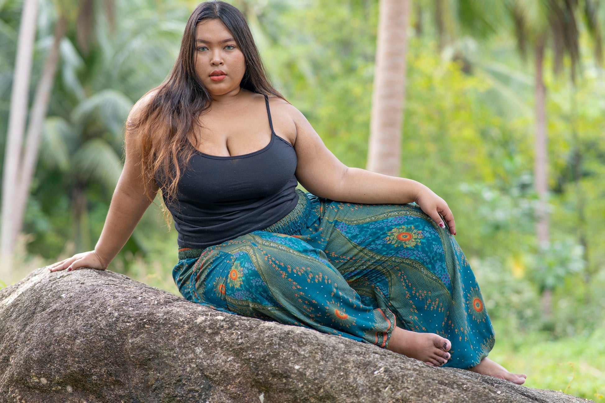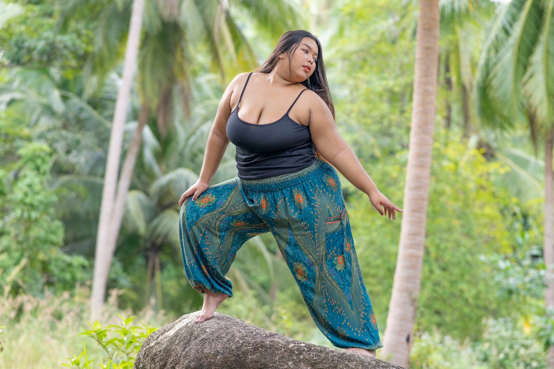 PLUS SIZE luftige Pluderhose mit Pfauenmuster in türkis