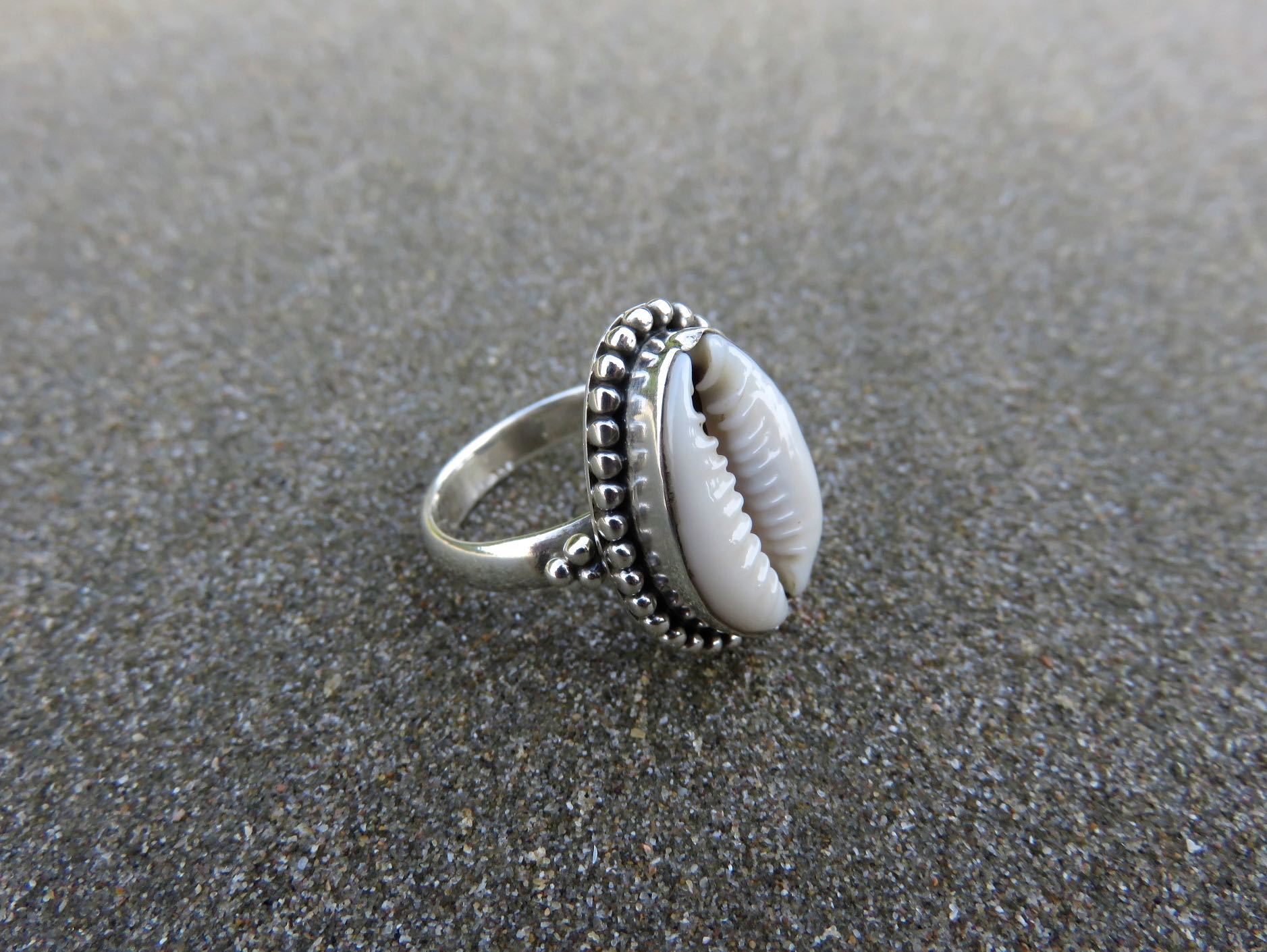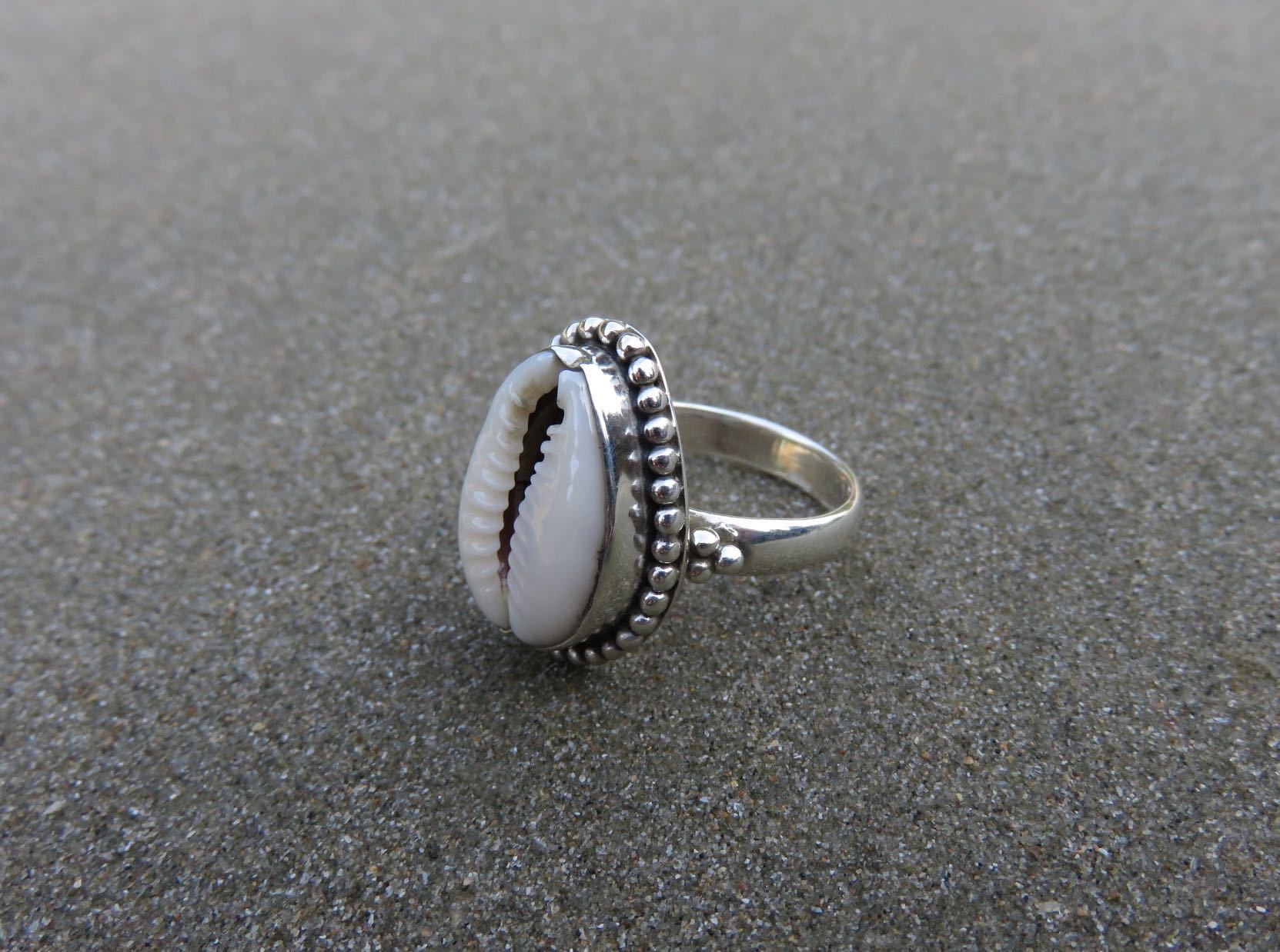 Ring mit Kaurimuschel verziert mit kleinen Kügelchen aus Silber