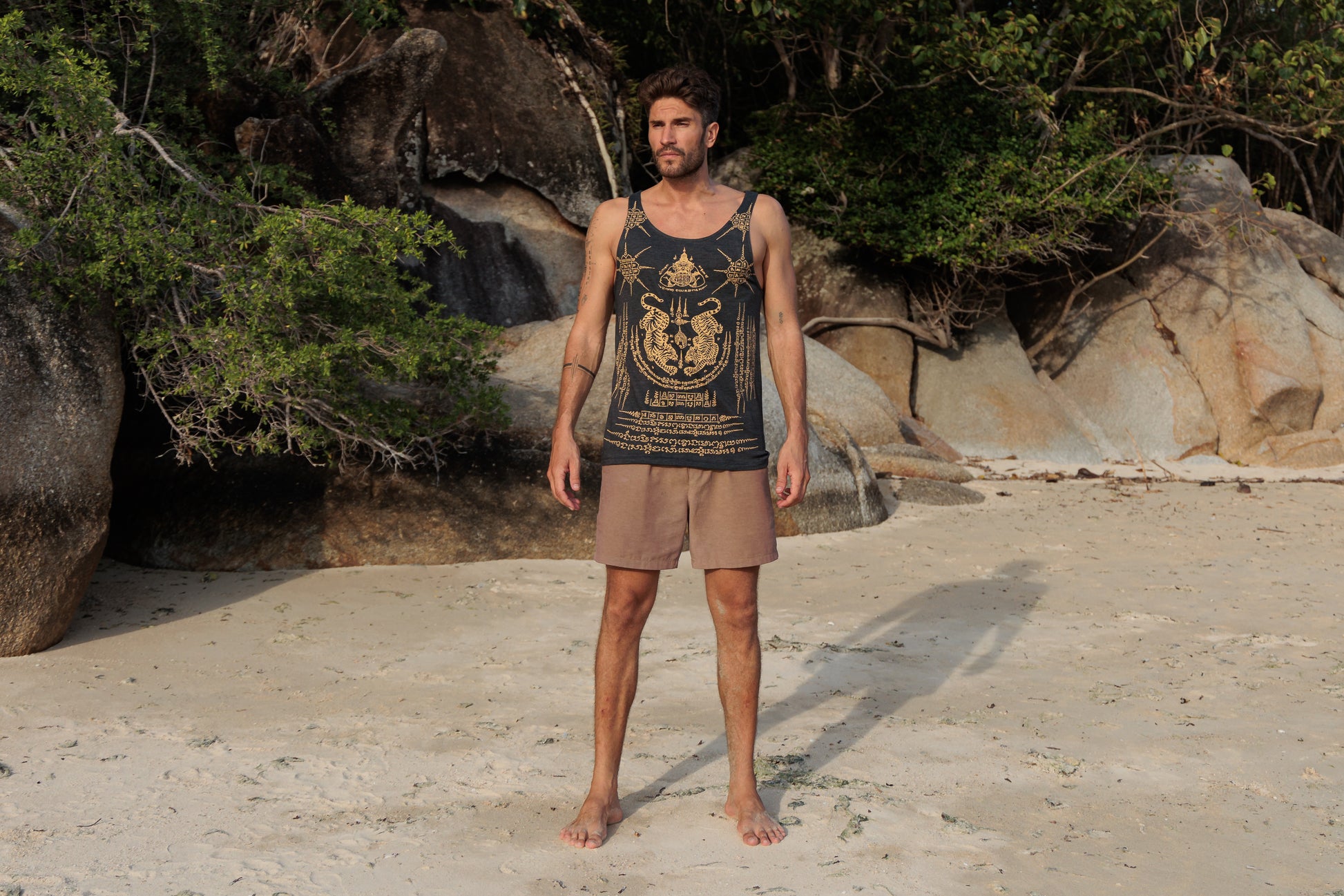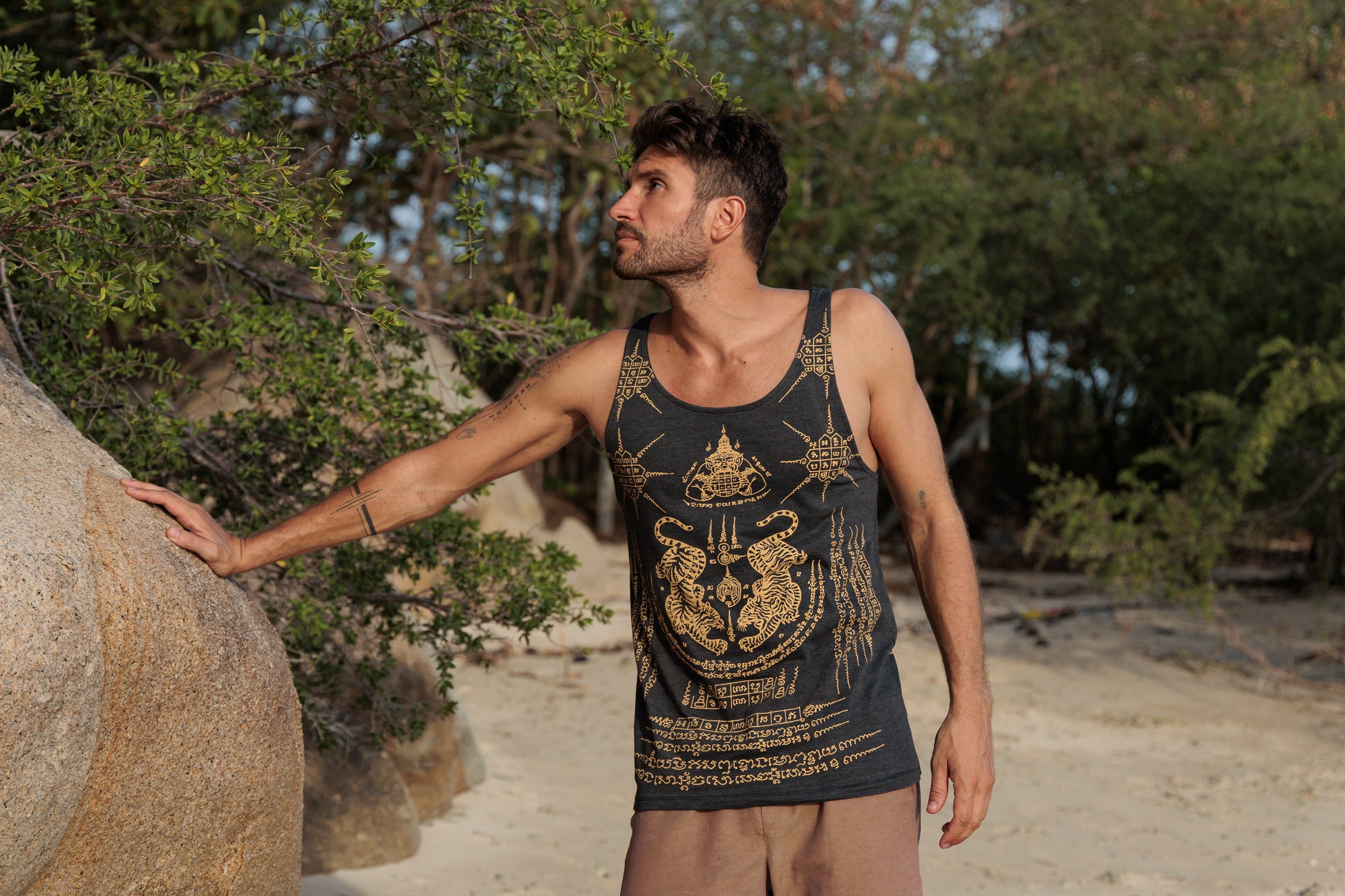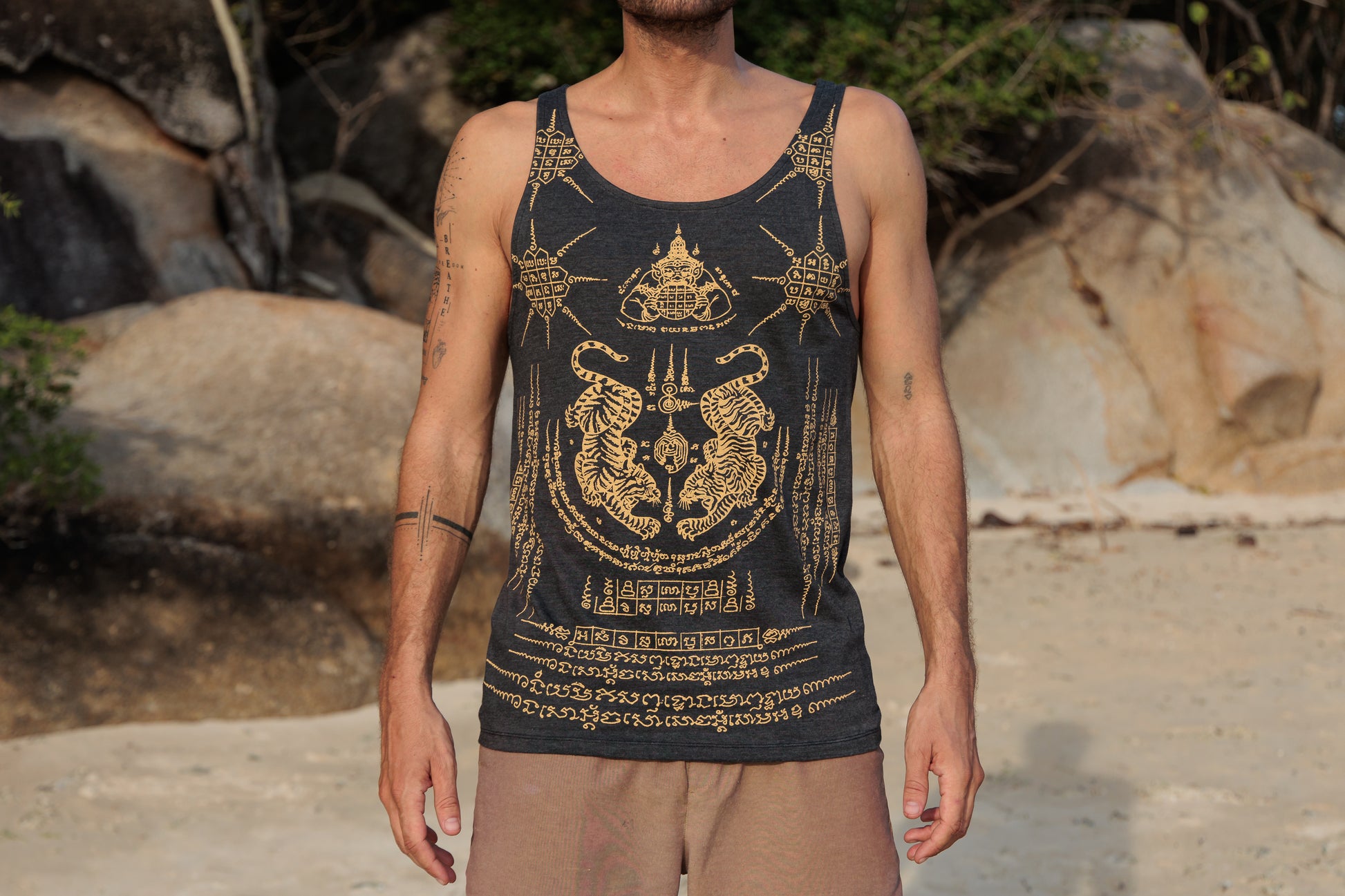 Sak Yant Muay Thai Tattoo Yantra Tanktop grau beige Tiger