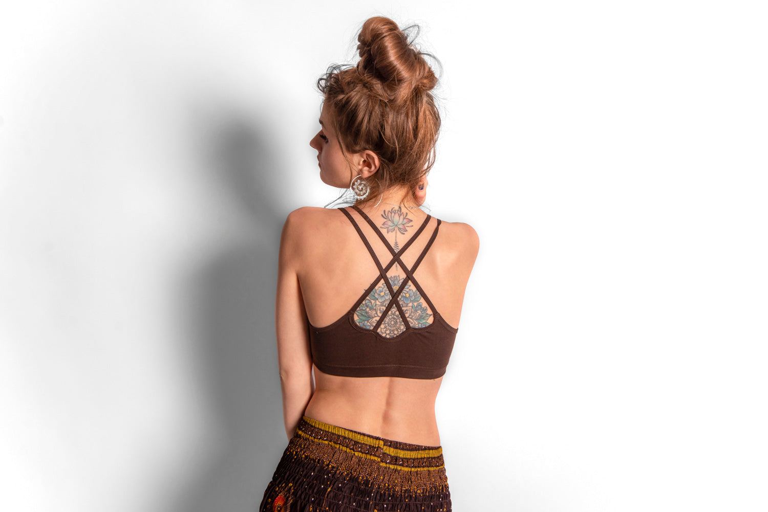 Yoga Top mit detailliertem Rückenmuster, bedruckt mit dem Muster der Lebensblume, braun