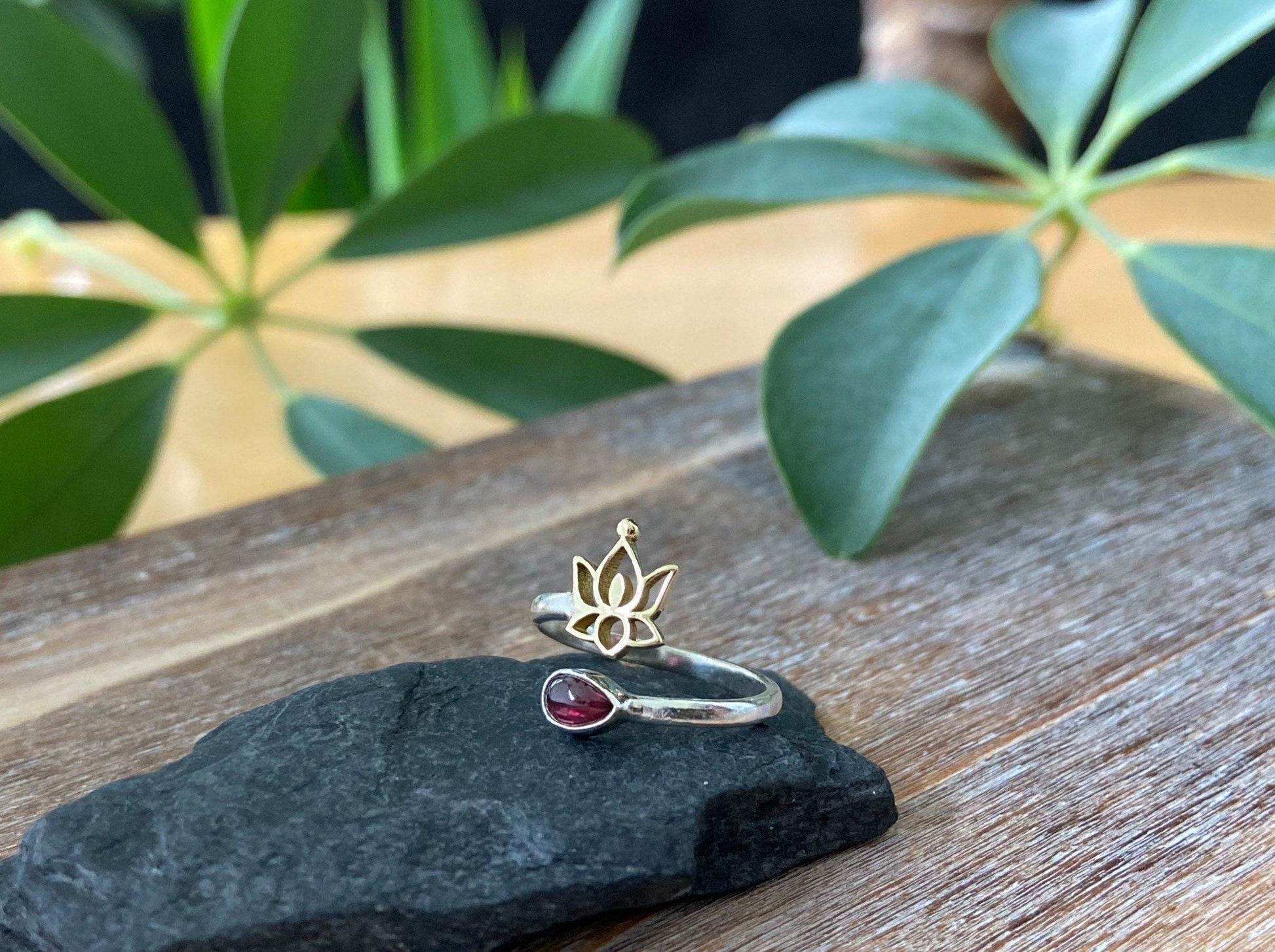 offener Zehenring mit Lotusblume und Stein in Tropfenform