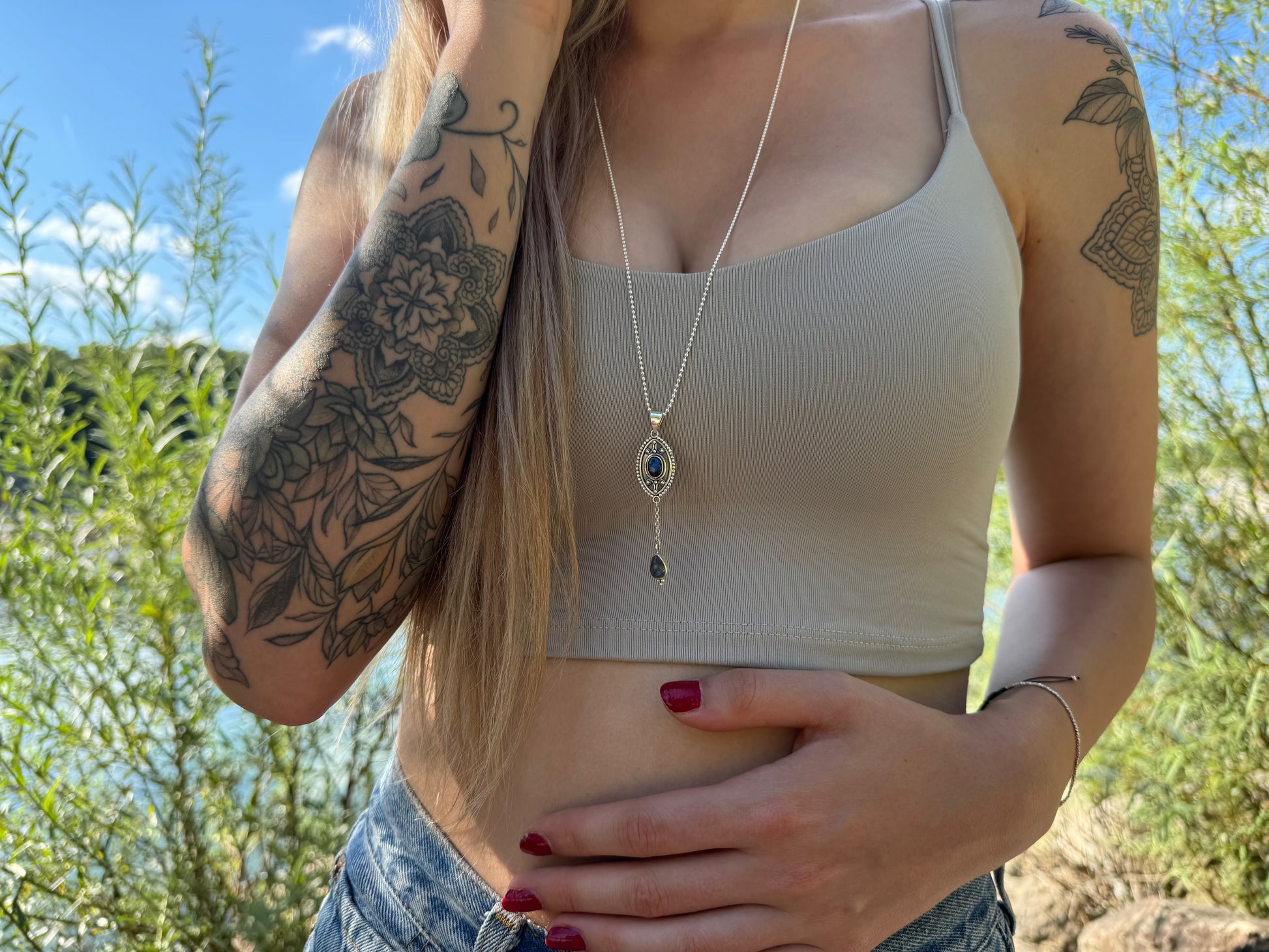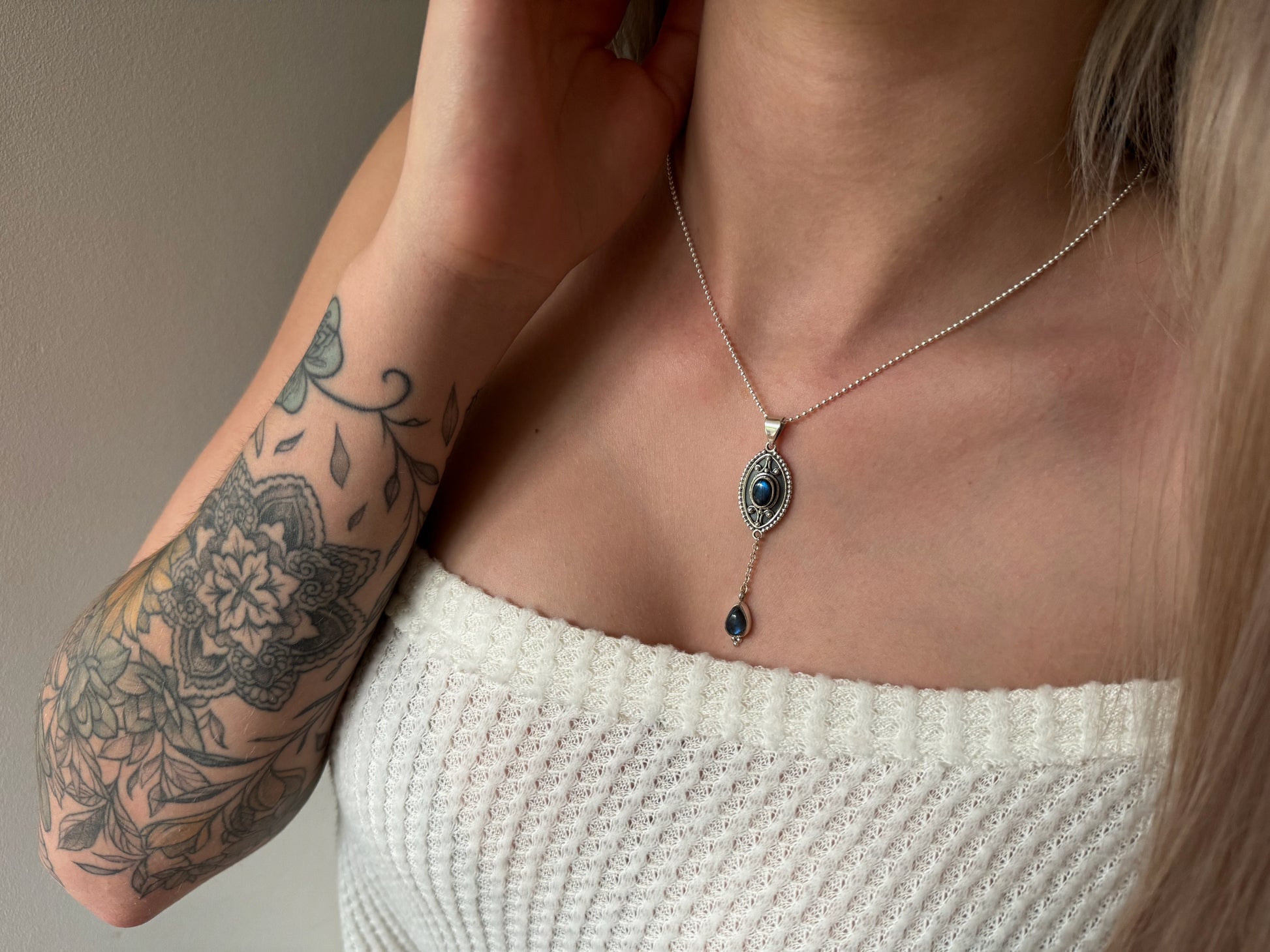 navette förmiger Anhänger mit Labradorit Stein und baumelndem Kettchen and Kugelkette.