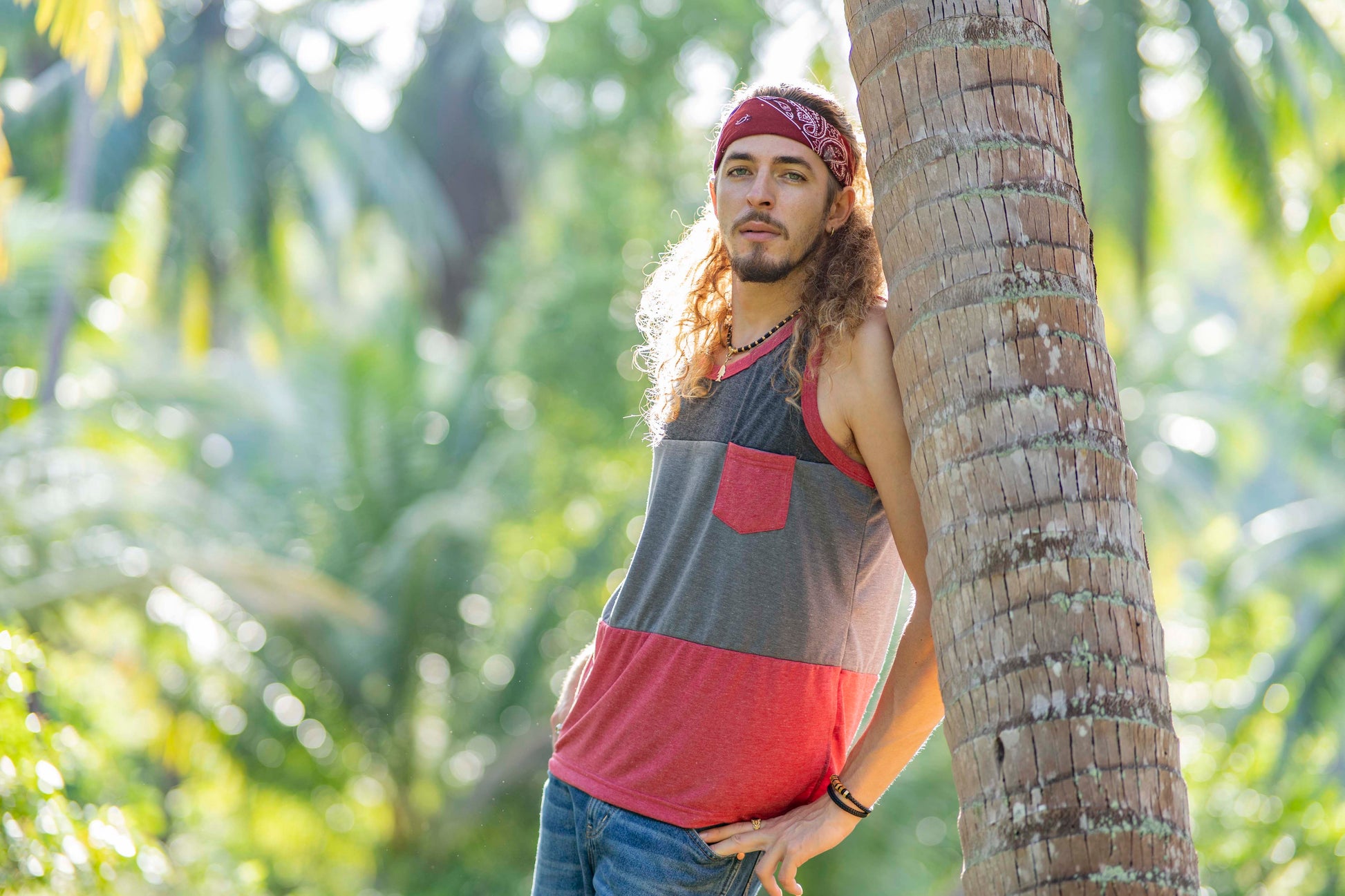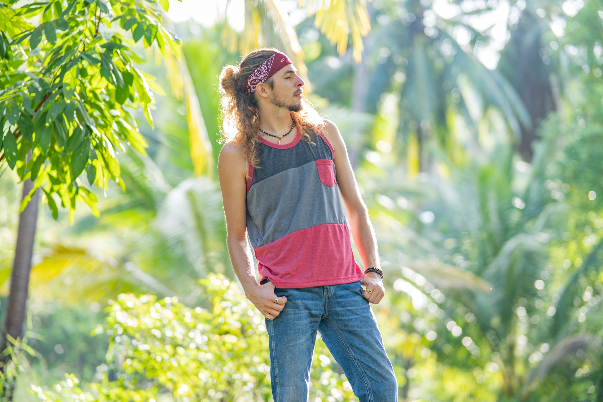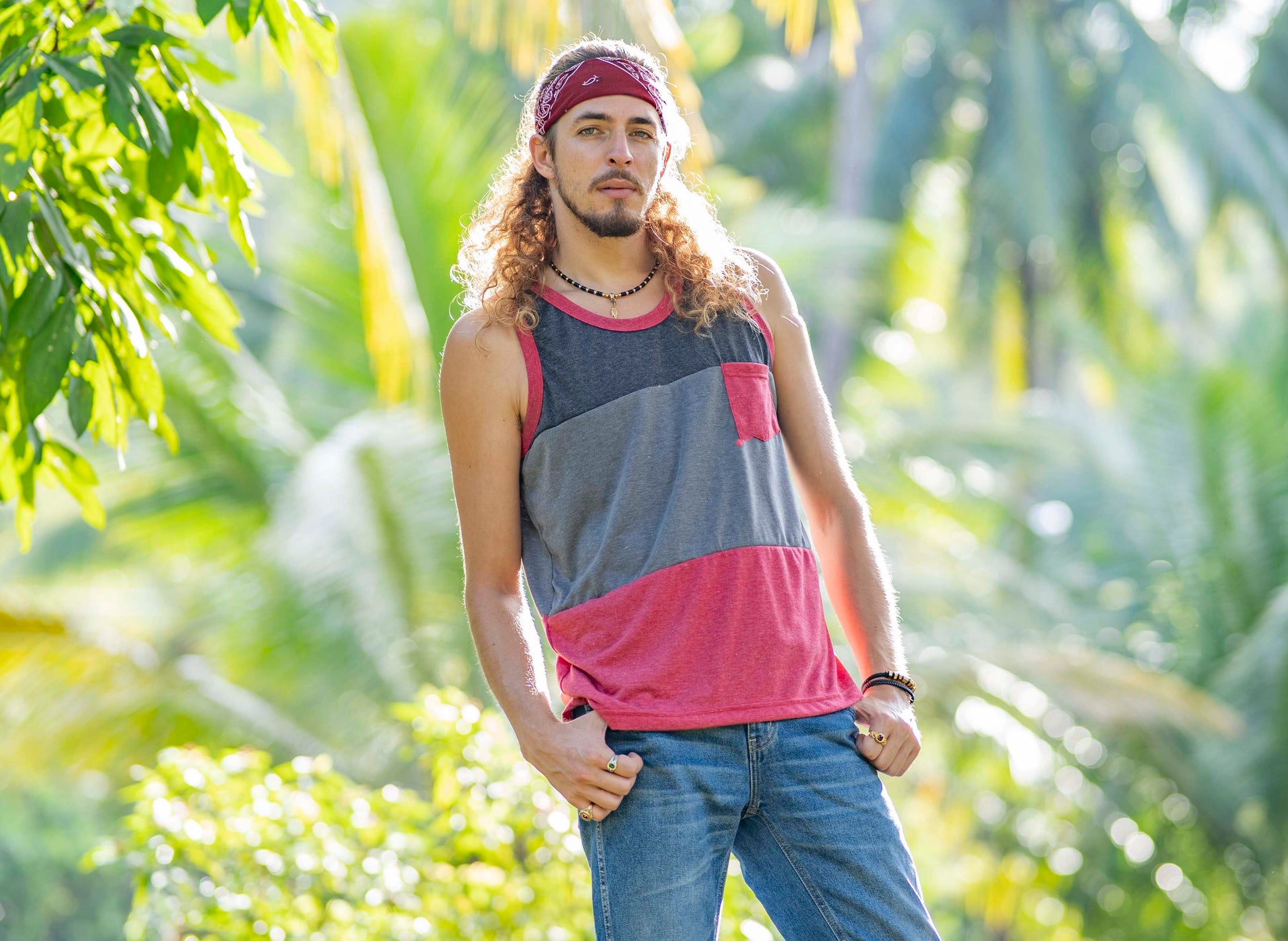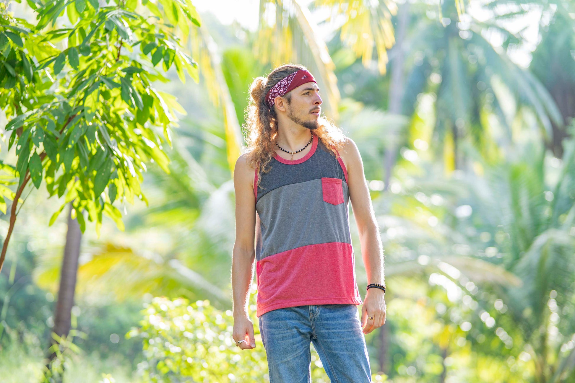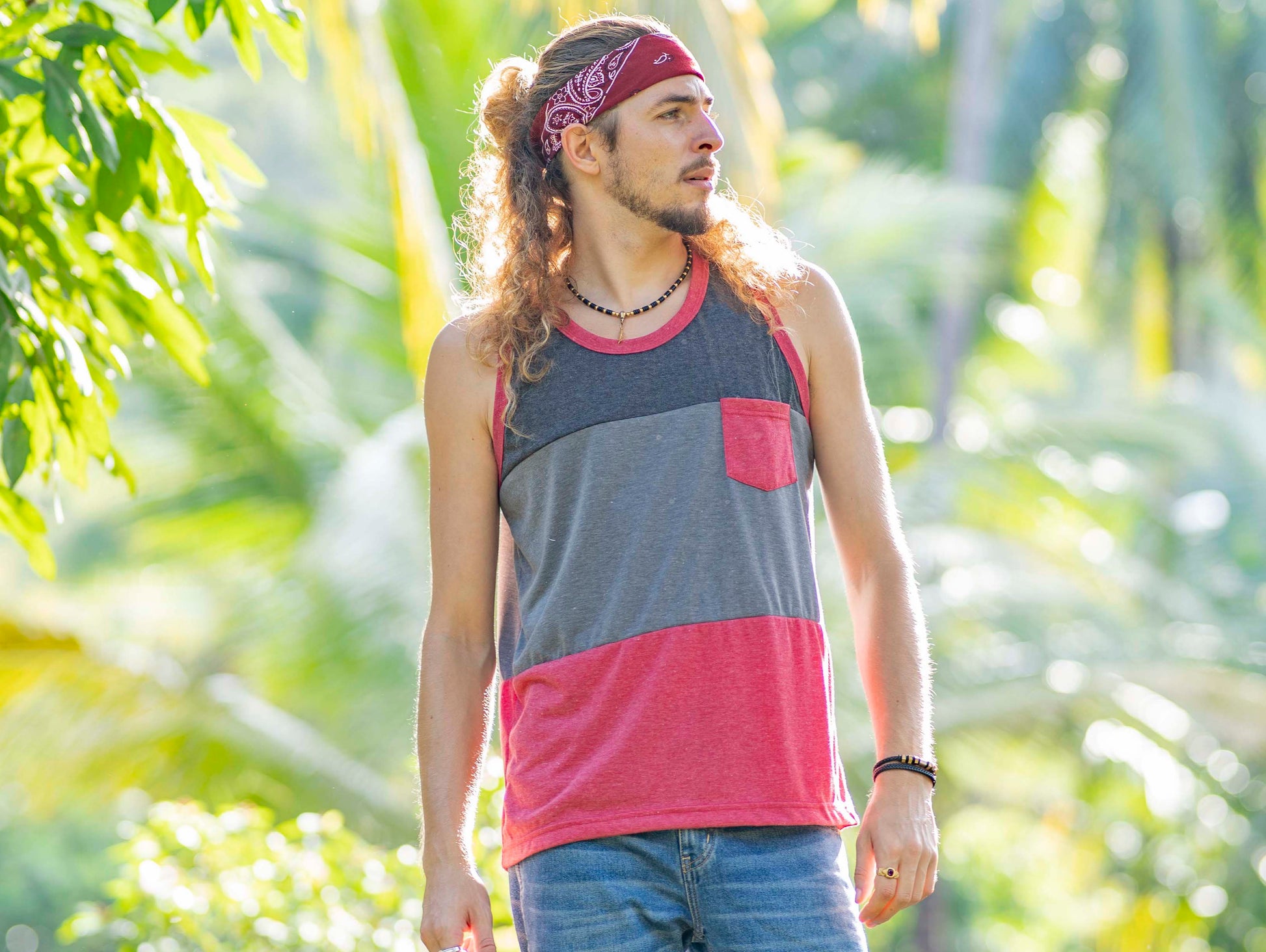 Tri-color tank top with chest pocket for men in red