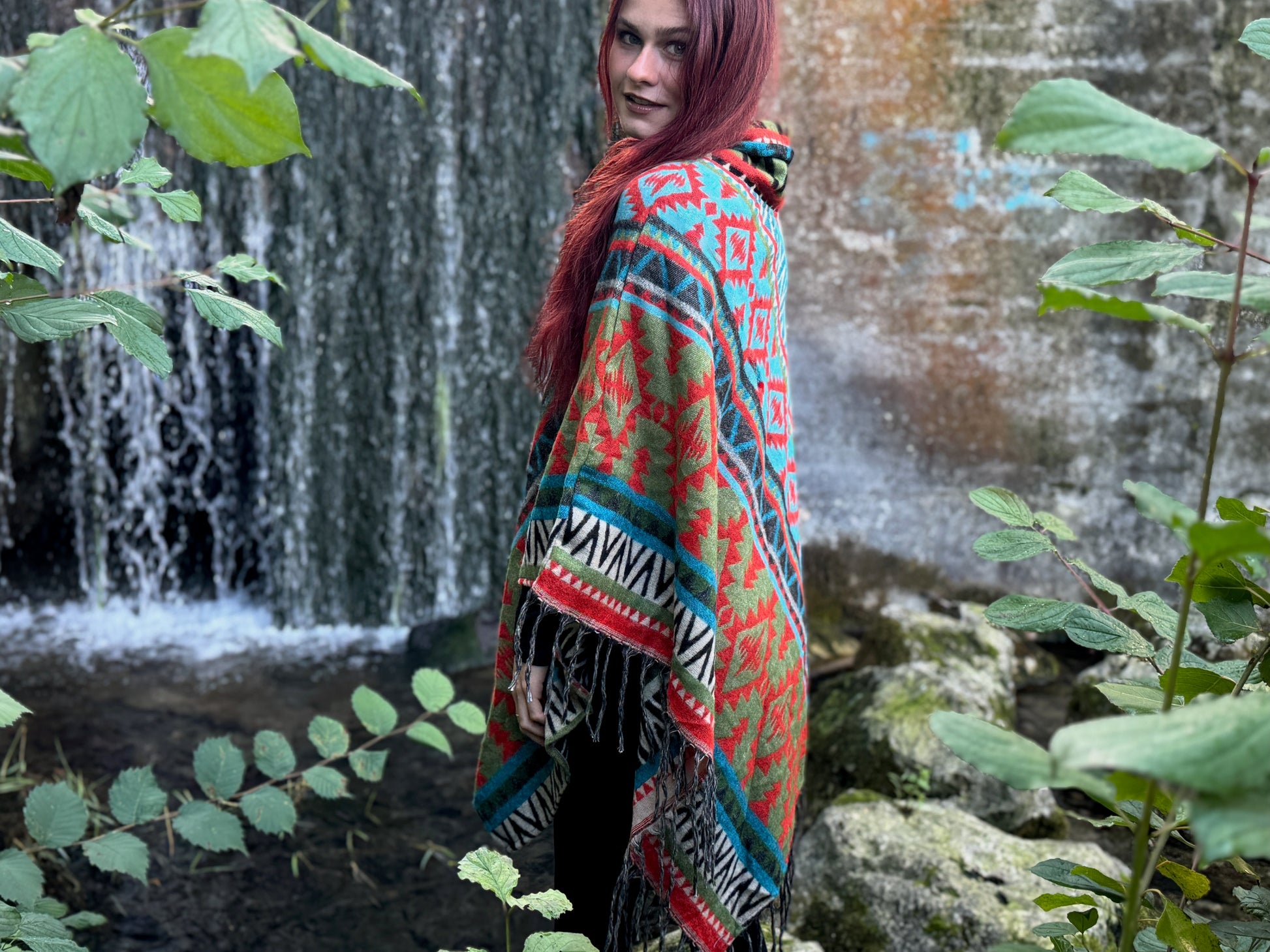 half-length, plain-colored knitted sweater with hood and thumbholes in rosé red