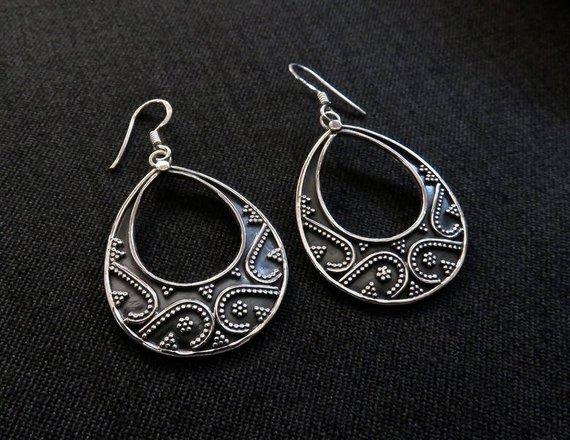 Teardrop-shaped, granulated earrings made of silver in an oriental design.