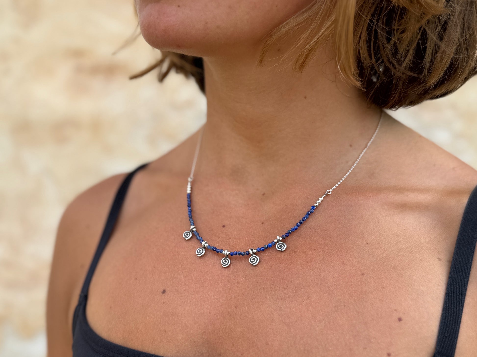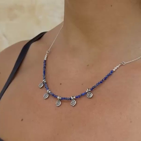 Kette mit 5 kleinen Spiralen und echten Lapislazuli Steinen, 925er Silber, längenverstellbar
