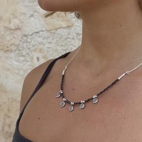 Kette mit 5 kleinen Spiralen und schwarzen Spinell Steinen, 925er Silber, längenverstellbar